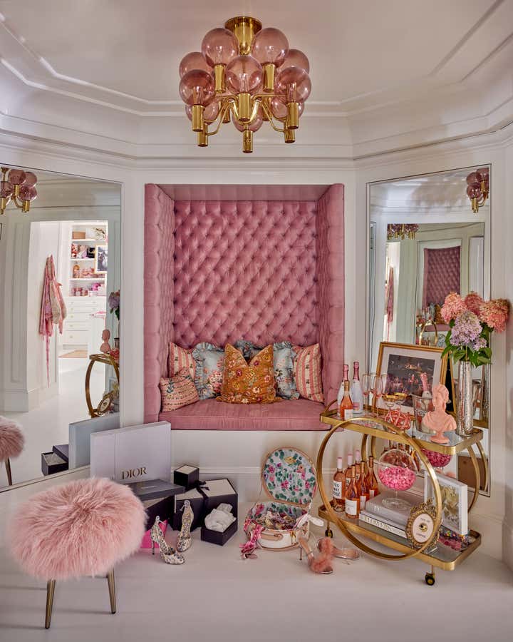Having four boys, this client needed a closet that could serve as a feminine retreat. Enter: THE Closet. Complete with a feather chandelier, pink marble bar, and rosé tap... Getting dressed never looked so fun!