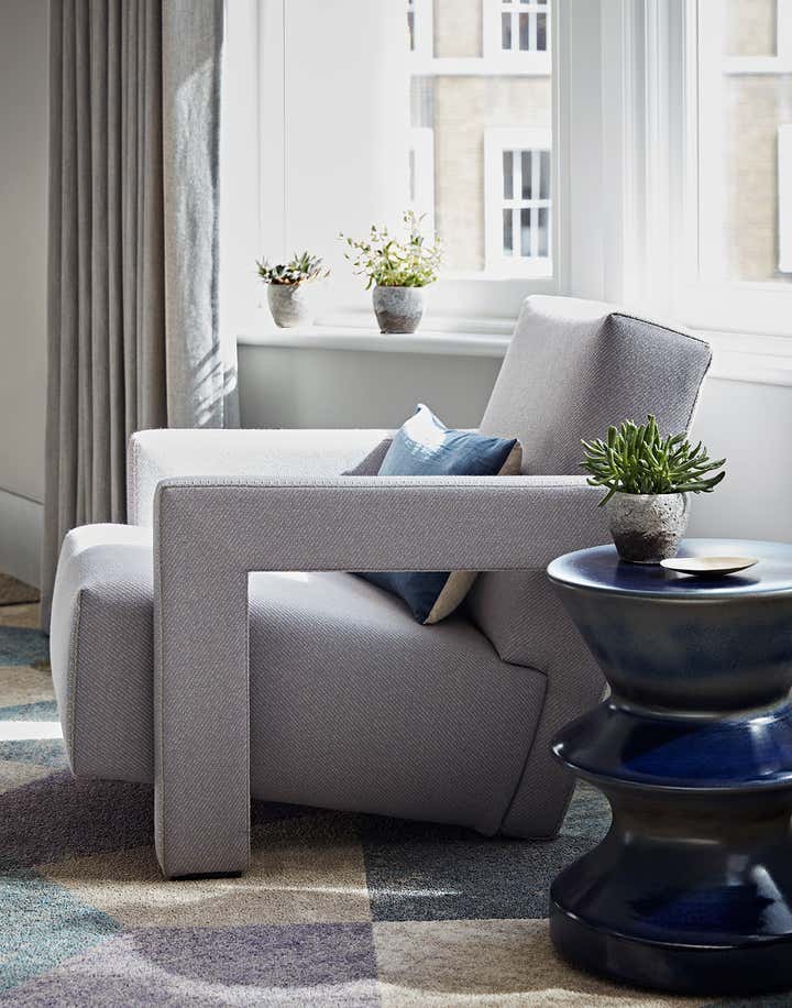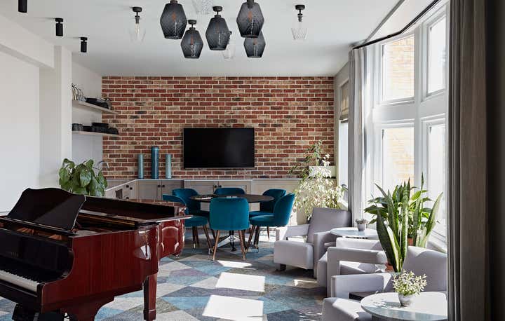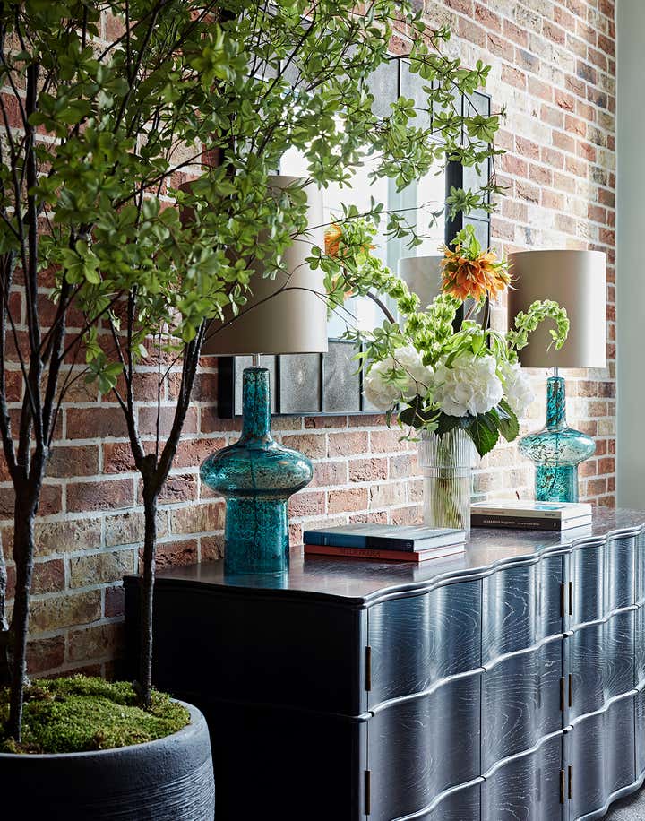 Graphite metal screens and exposed brickwork were softened with a pastel palette, vintage lights and plenty of plants. Earthy materials like raw oak and stoneware were mixed with honed marble and cotton velvet to produce a richly layered atmosphere.