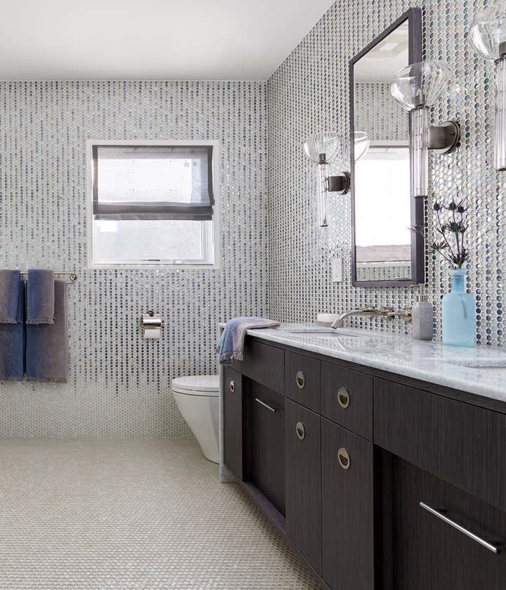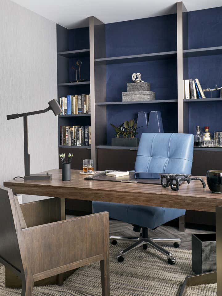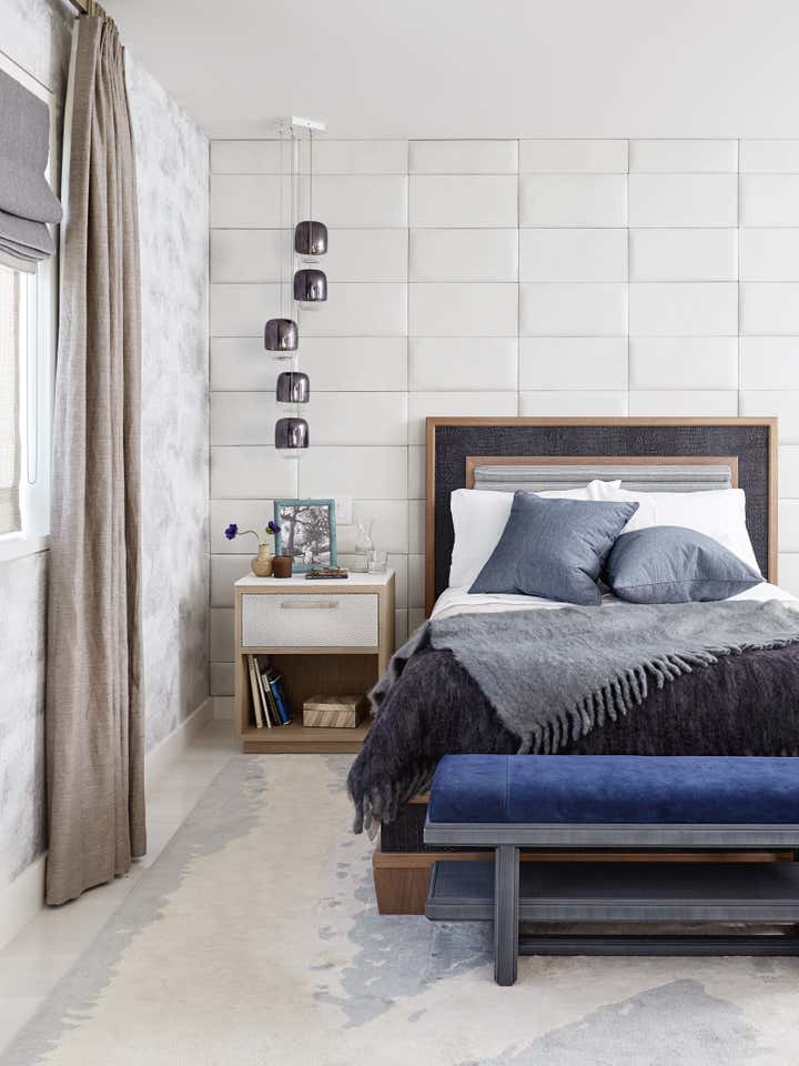 I mixed a range of furniture styles, both new and old, to create an edgy young flair in the open-plan living and dining areas, as well as in the kitchen. In the living room a cashmere-wrapped 80’s style sectional is juxtaposed with a modern, architectural leather-wrapped sofa and reupholstered vintage Harvey Prober swivel chairs. In the master bedroom, I continued the playful mix of materials and shapes. I custom designed a roll-tufted headboard with an embossed leather inset panel and oil rubbed wood frame. Icy blue leather-wrapped wall tiles, a cobalt suede bench and custom nightstands with hammered metal drawer faces illustrate the attention to detail and the need to create layered spaces full of visual surprise. Every single nook in this home was thought out, designed and executed within the tight time frame. It was the most comprehensive project I have ever completed in so little time to date.