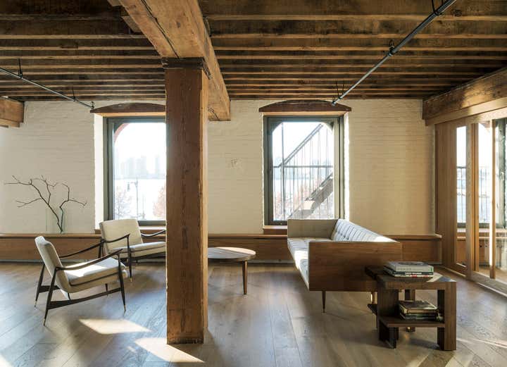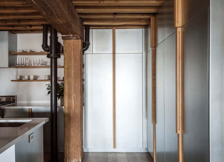 This 1500 SF loft apartment is located in one of Tribeca's most beautiful turn-of-the-century brick buildings. The renovation transformed a poorly layed out floorplan into a series of serene spaces. Restored original wood beams and columns, existing brick walls, and new millwork pieces come together to create a sequence that is both rich and spare. Custom cabinetry, crafted from zinc and oak, complements the existing context. A dynamic play of light and dark exists throughout the day, as the zinc panels reflect the changing light of the Hudson River below.