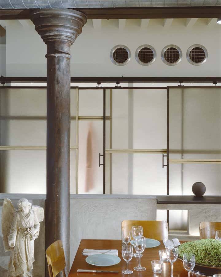 This full floor of a former butter warehouse was left mostly open to keep the drama of its 80-foot long interior. Sustainable bamboo floors and cabinetry are tailored simply with exposed steel against a quiet backdrop of white walls and natural gray concrete. Polycarbonate screens conceal service areas when desired.