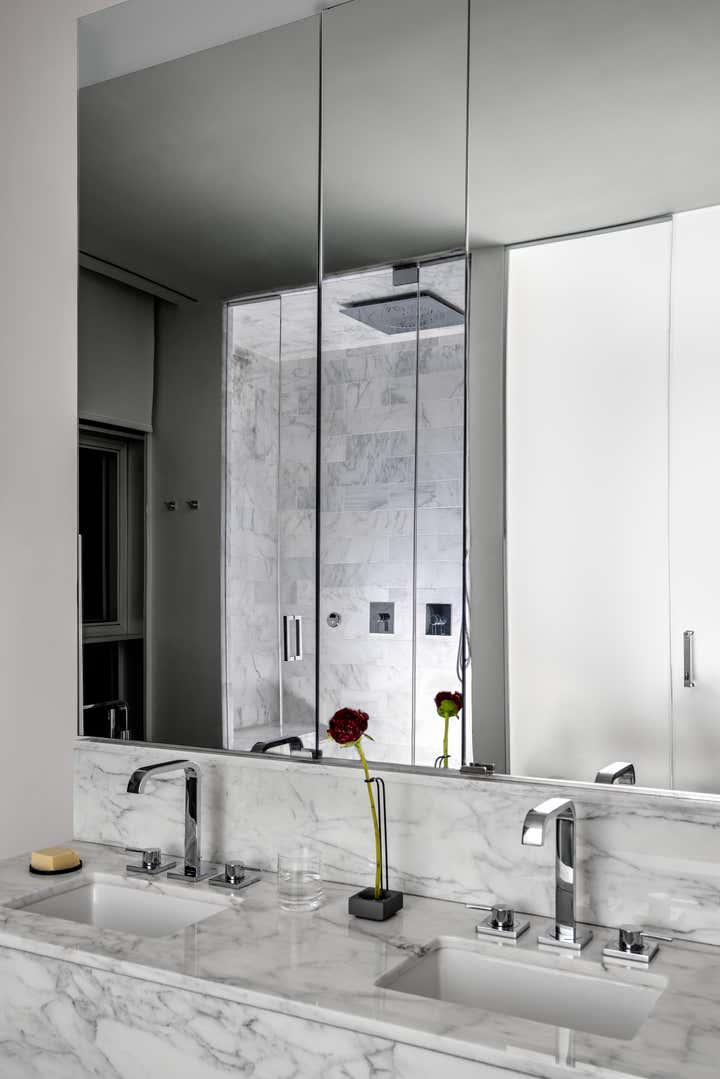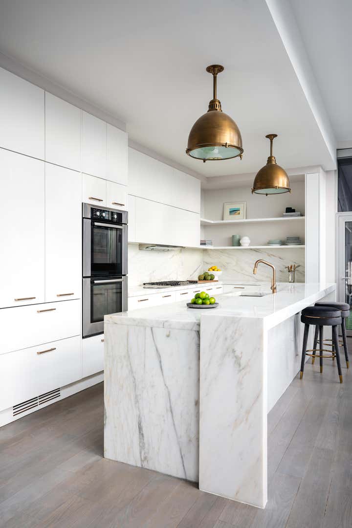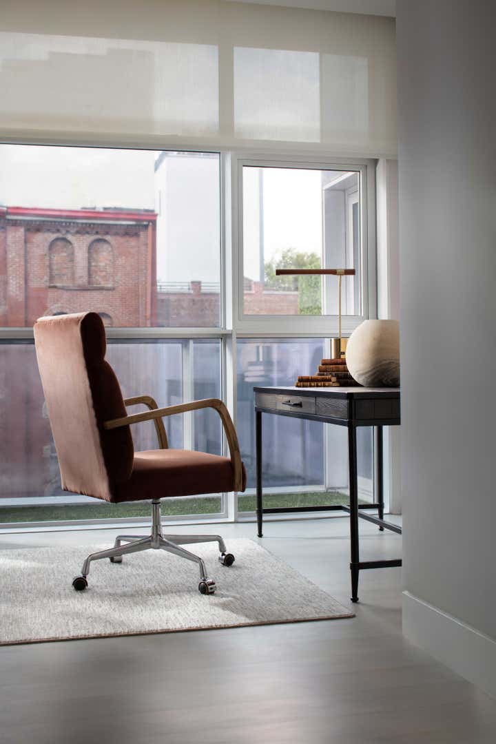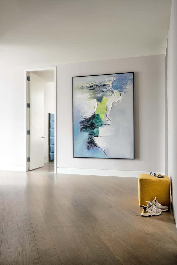 The result is a modern, functional apartment with three bedrooms, each with its own closet and an en suite bathroom. The existing pantry space was reconfigured into a bar for entertaining. The den was separated from the kitchen to create a home office with a sofa bed, which allowed for installation of more cabinets in the kitchen, expanding storage.
