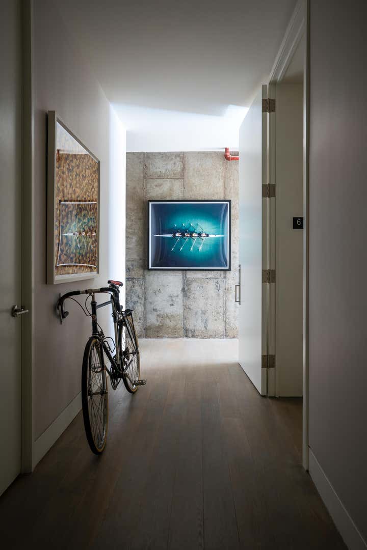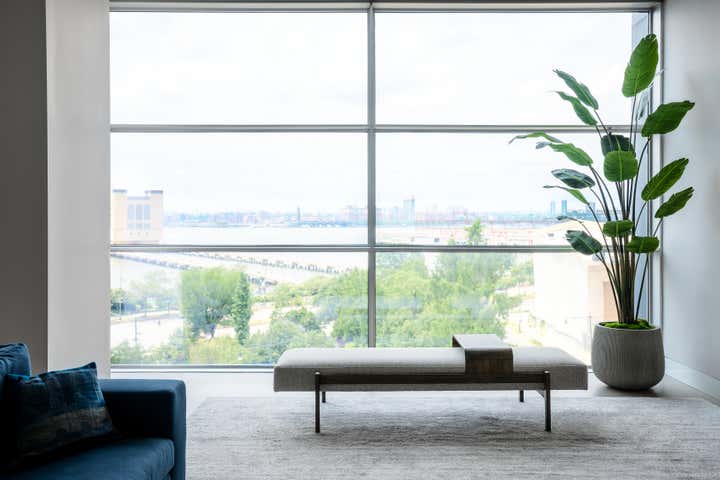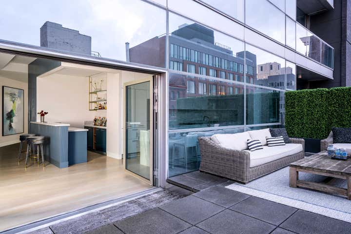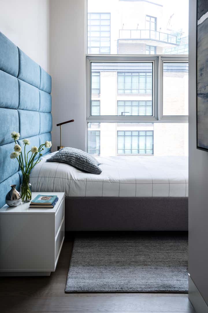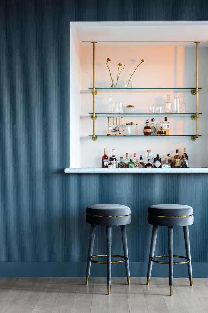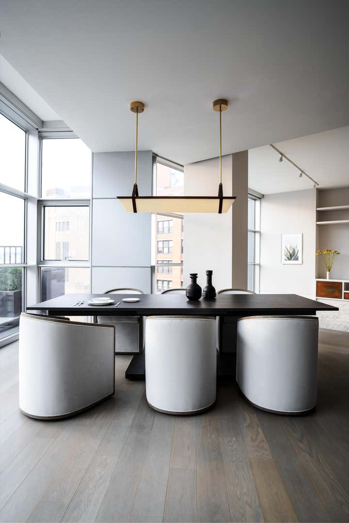 The result is a modern, functional apartment with three bedrooms, each with its own closet and an en suite bathroom. The existing pantry space was reconfigured into a bar for entertaining. The den was separated from the kitchen to create a home office with a sofa bed, which allowed for installation of more cabinets in the kitchen, expanding storage.