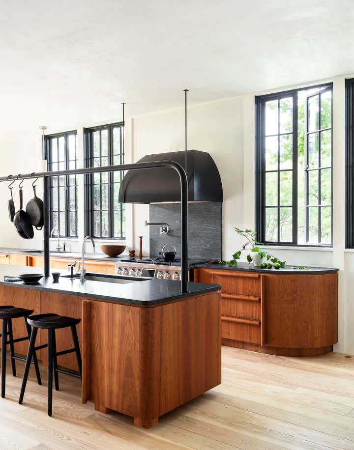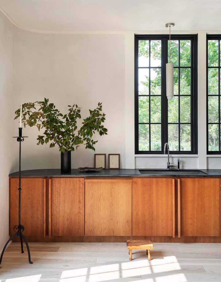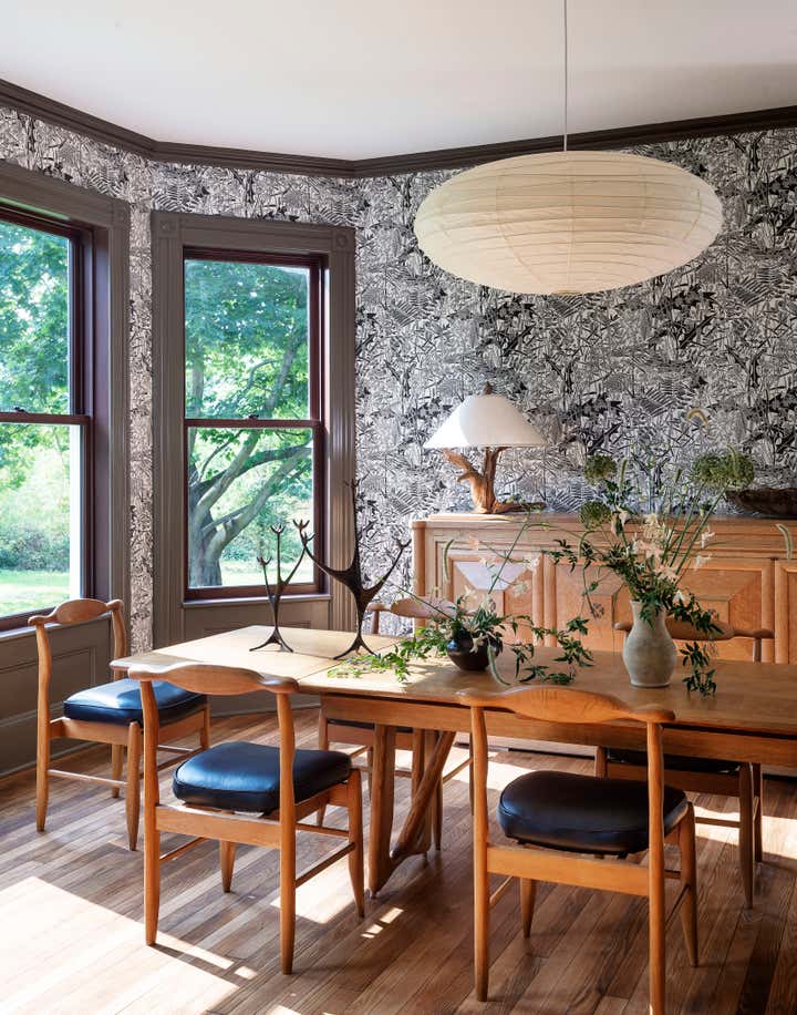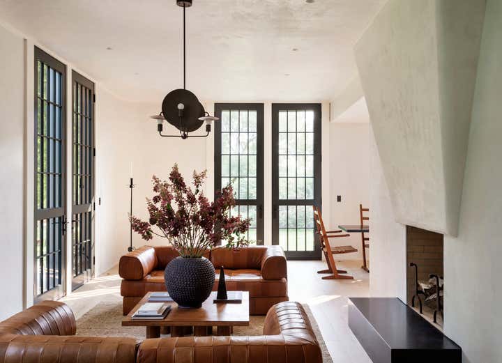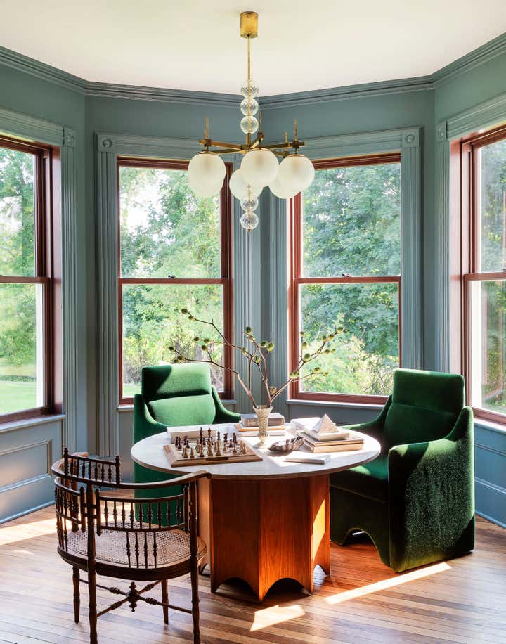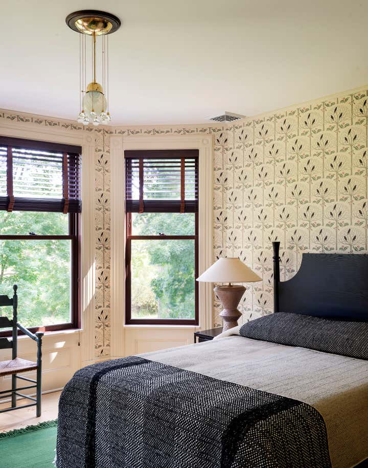 An enveloping palette of blue-green hues, alongside a myriad of wallpapered rooms, creates a whimsical sequence of spaces within the original Victorian Structure. The second story can be reached via two opposing stairs - one in 19th-century mahogany paneling, and the other in a towering plaster volume. The primary bedroom is housed in the addition, with tree-house-like views of the surrounding meadows, while the family and guest bedrooms are housed in the original structure. As a whole, the project embodies our distinct approach to buildings, interiors, and lighting - exploring the dialogue between beauty and necessity.
