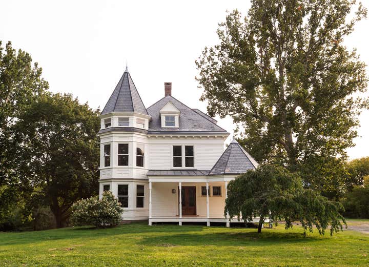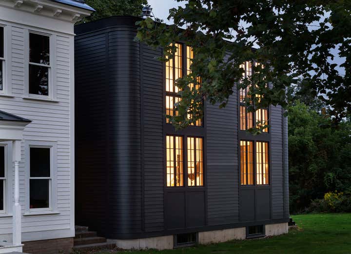 The Twin Bridges House combines our studio's three core typologies - buildings, interiors, and lighting - into one holistic vision. Set within the landscape of the Hudson Valley, the project juxtaposes two structures against each other. The original Eastlake Victorian, built in 1860, is joined by a modern farm pavilion, with daring interiors to match. The pavilion is a ground-up addition that sits confidently behind the restored Victorian structure, drawing influences from the local Dutch and Shaker vernacular while referencing the rounded forms found often in early Victorian homes in America. The addition is a straightforward, monumental form, acting as a lantern in the landscape. Clad in painted wood clapboard, and rounded at four corners, the pavilion is set against the restored victorian, painted white as in Edward Hopper's House At Eastham.