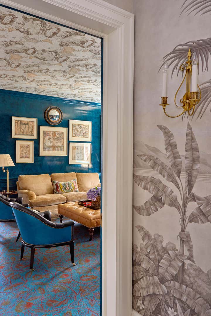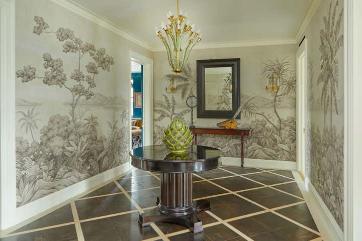 This Upper Eastside project started out with a great bones apartment and a simple brief: traditional but adventurous... We set out planning the schemes and some turned out more colorful than what the client had thought he wanted but we went with it. The apartment did not have a dining room per se, so we designed a center table (featuring an amazing Christopher Spitzmiller artichoke tureen) with Victoria & Son for the Entry Hall, which could be extended via leaves, surrounded by ballroom chairs with green leather cushions and host and hostess chairs pulled from the living room desk and voila - dinner for 8 or 10.... The extra chairs and leaves (in a custom case lined in felt) could thankfully live in the basement when not in use. While the Library was finished in 'Prussian Blue' fantasy burl by Artgroove, the Living Room is Venetian Plaster, the Kitchen received the iconic Stockwell 'Martinique' paper and a custom Verre Eglomise backsplash by Miriam Ellner. There is a blue bedroom and a more 'neutral' bedroom and a very fun elevator vestibule with a sadly discontinued Brunschwig & Fils 'Lasagna and Tomato Sauce' wallpaper...