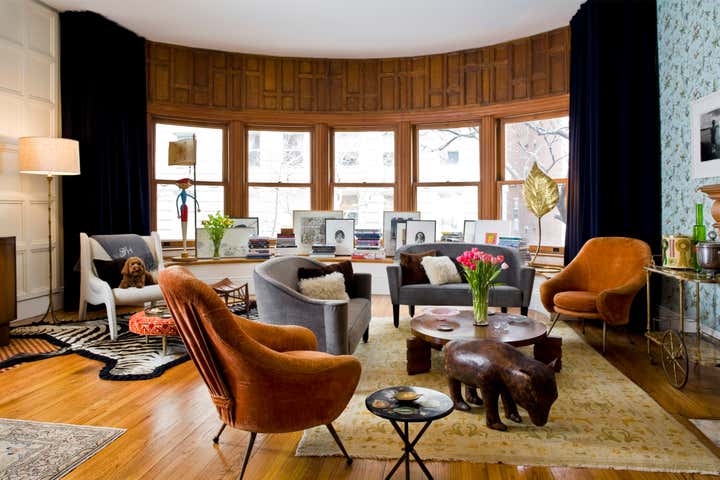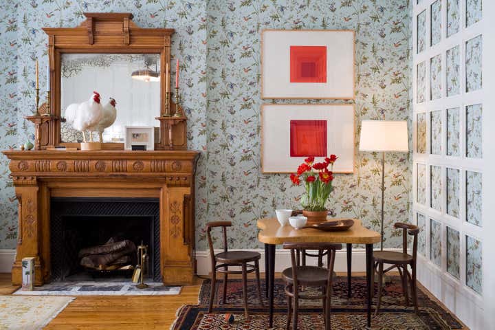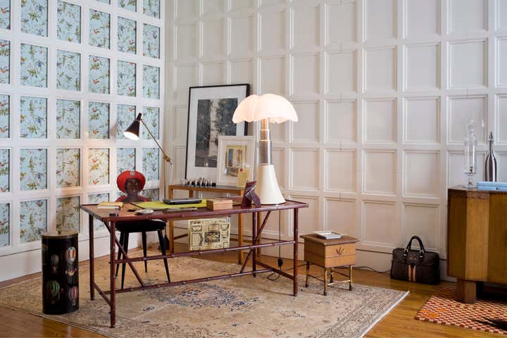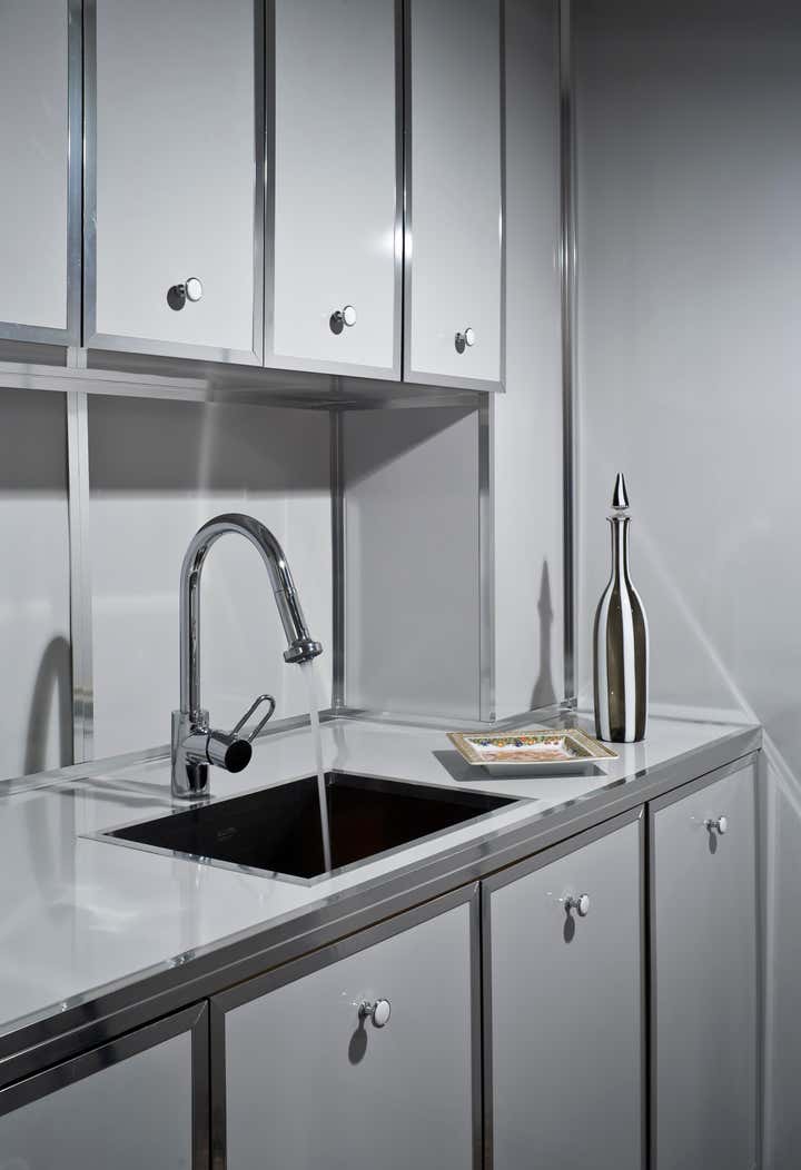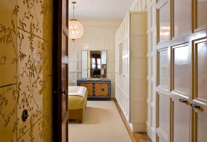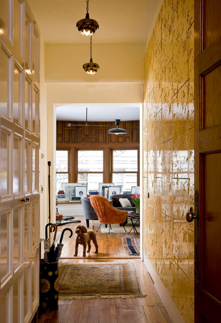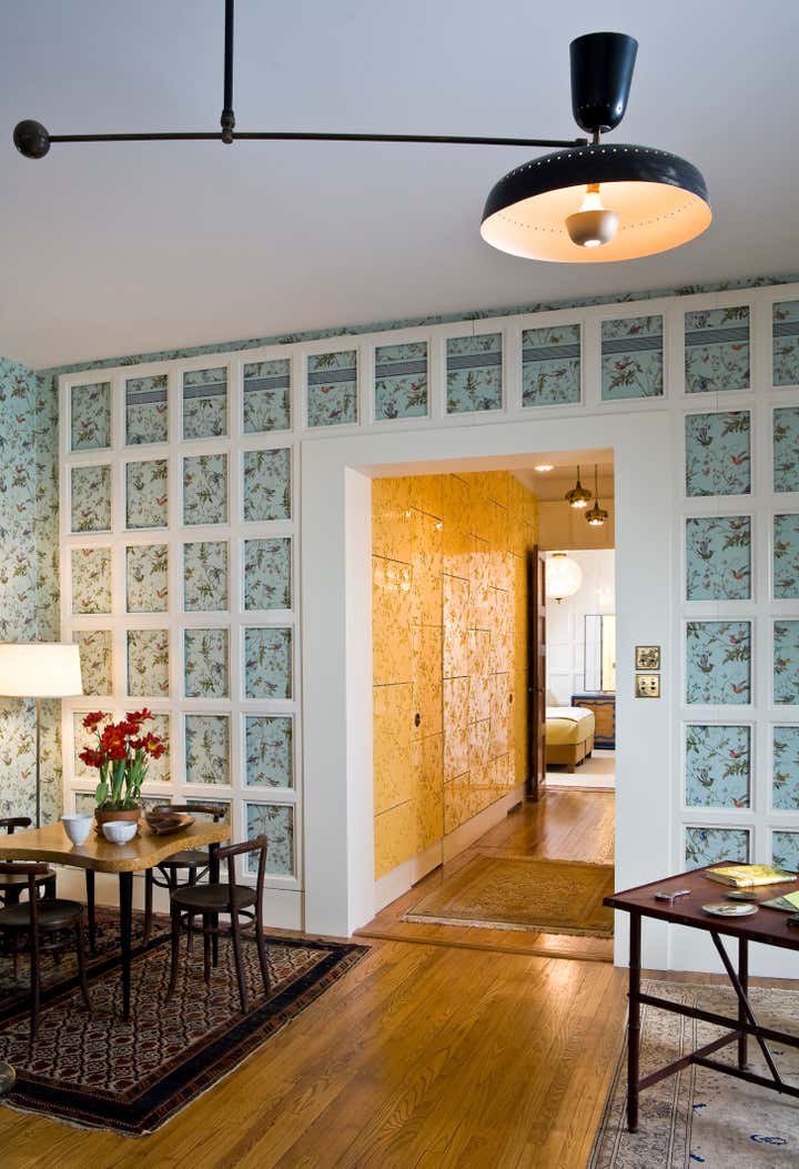 Original detail and texture are restored in this full floor of a limestone mansion on the Upper East Side, but by using new technology and fabrication techniques. Paneling is made from laser-cut sheets of composite wood and installed as prefabricated units, rather than hand made on site. Three-dimensional wallpaper was derived from the original English wallpaper pattern and laser cut into 1/4" deep panels, clipped to the walls, in a repeat system like conventional wallpaper patterns. The wall is lacquered gold to brighten the corridor between the front and back of the space. The kitchen conceals all appliances, and reads as a luxurious bar made of gray porcelain panels trimmed in polished aluminum.