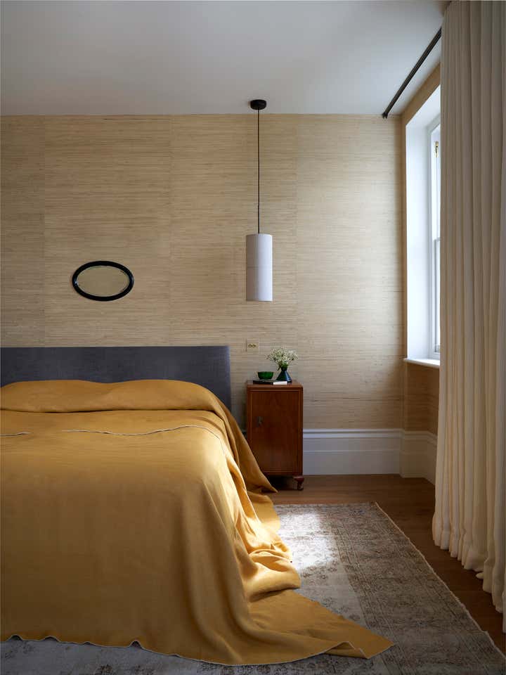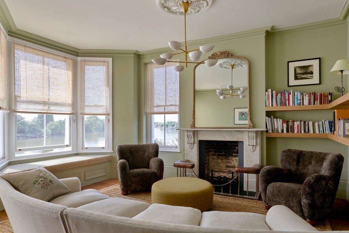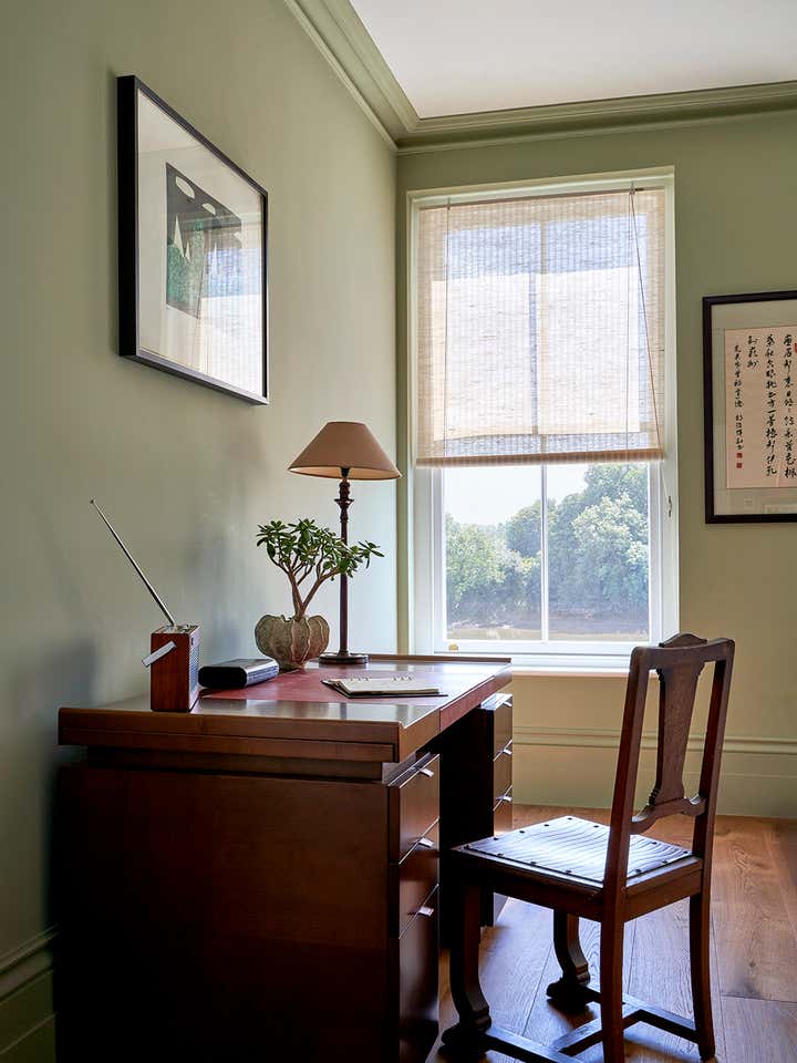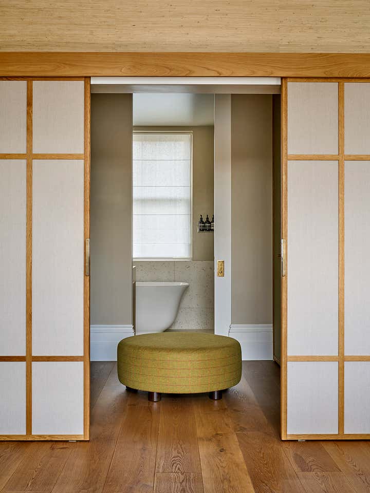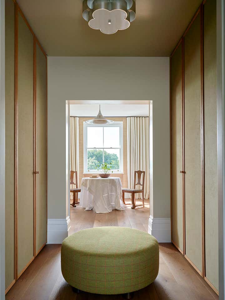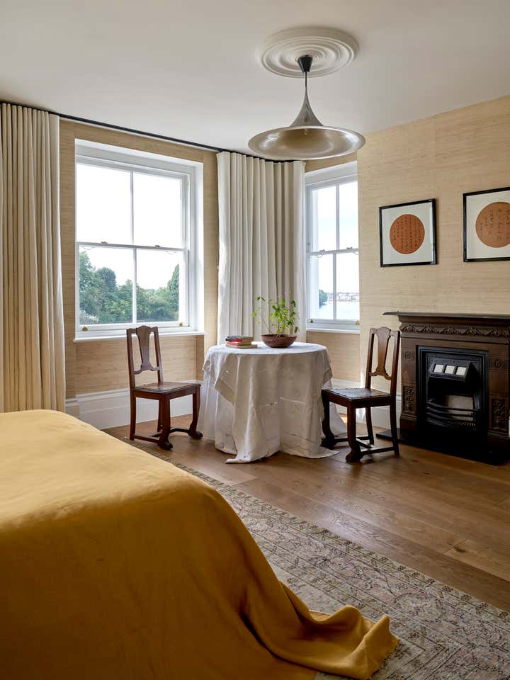 Upstairs, Stelly Selway designed the living room to frame a panoramic view of the Thames. Substantial changes to the floor plan were also made in the primary bedroom. By removing a series of cumbersome walls that originally separated the bedroom, dressing room, and bathroom areas, Stelly Selway implemented a more cohesive layout that redefines underutilized zones.