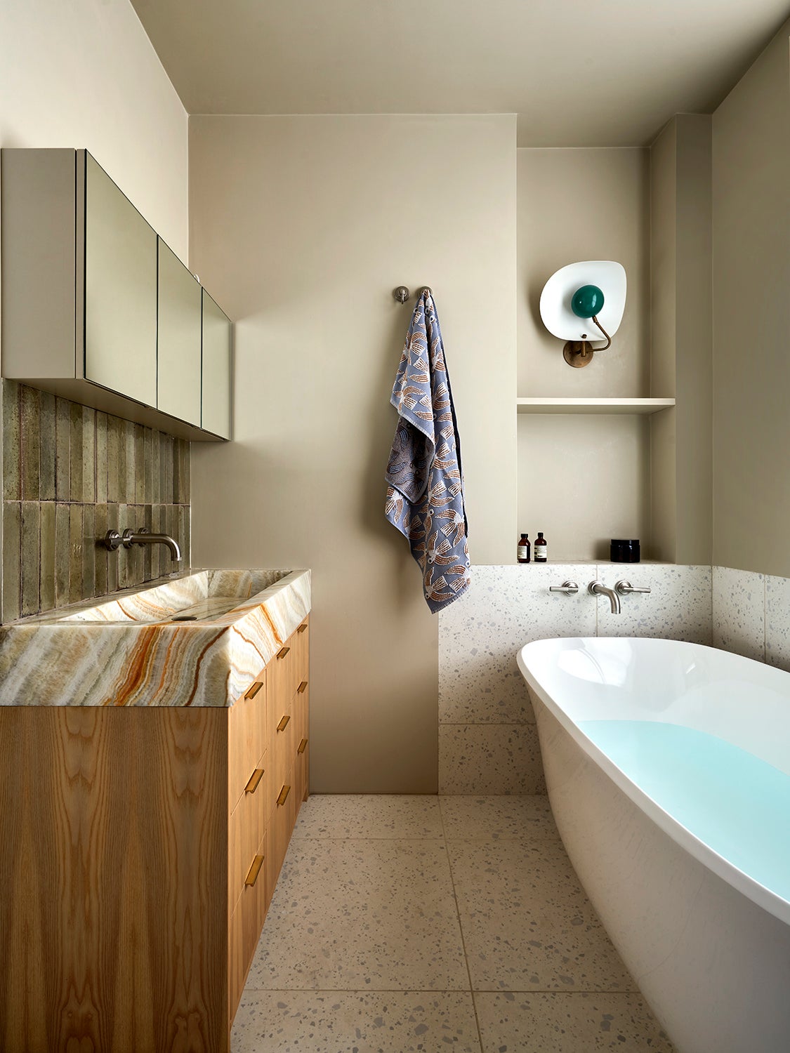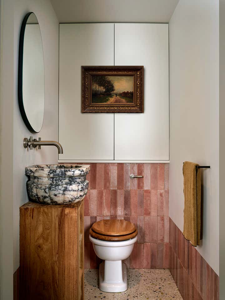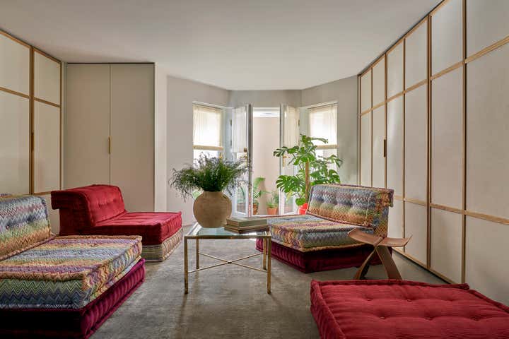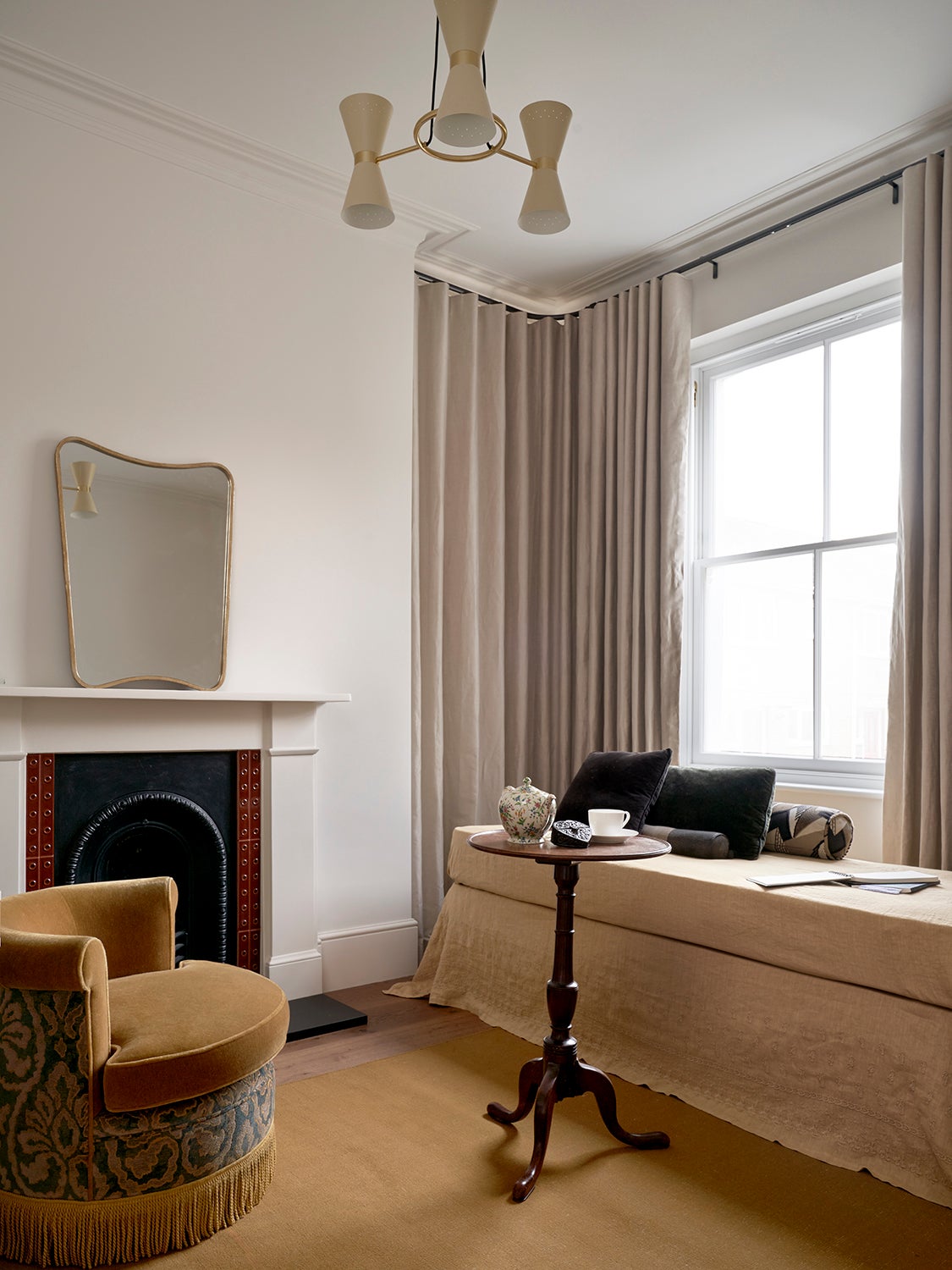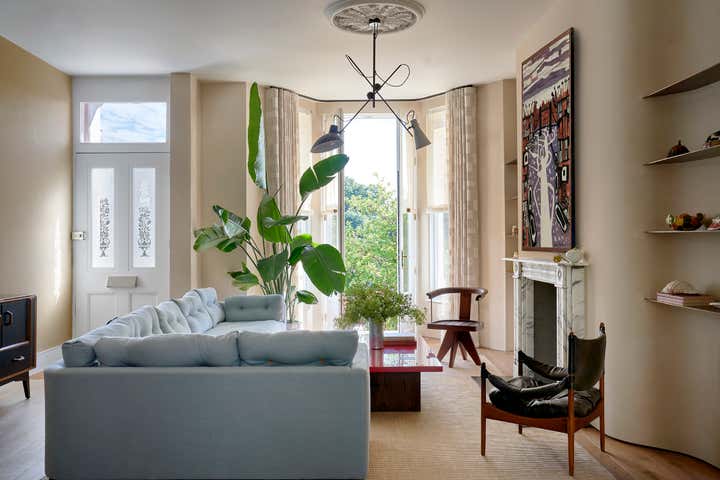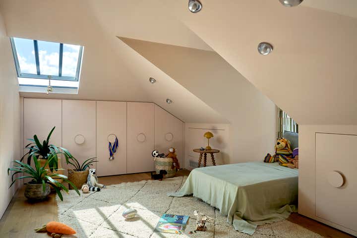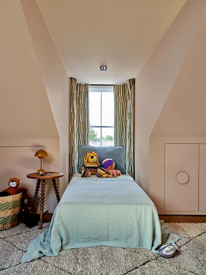 Upstairs, Stelly Selway designed the living room to frame a panoramic view of the Thames. Substantial changes to the floor plan were also made in the primary bedroom. By removing a series of cumbersome walls that originally separated the bedroom, dressing room, and bathroom areas, Stelly Selway implemented a more cohesive layout that redefines underutilized zones.