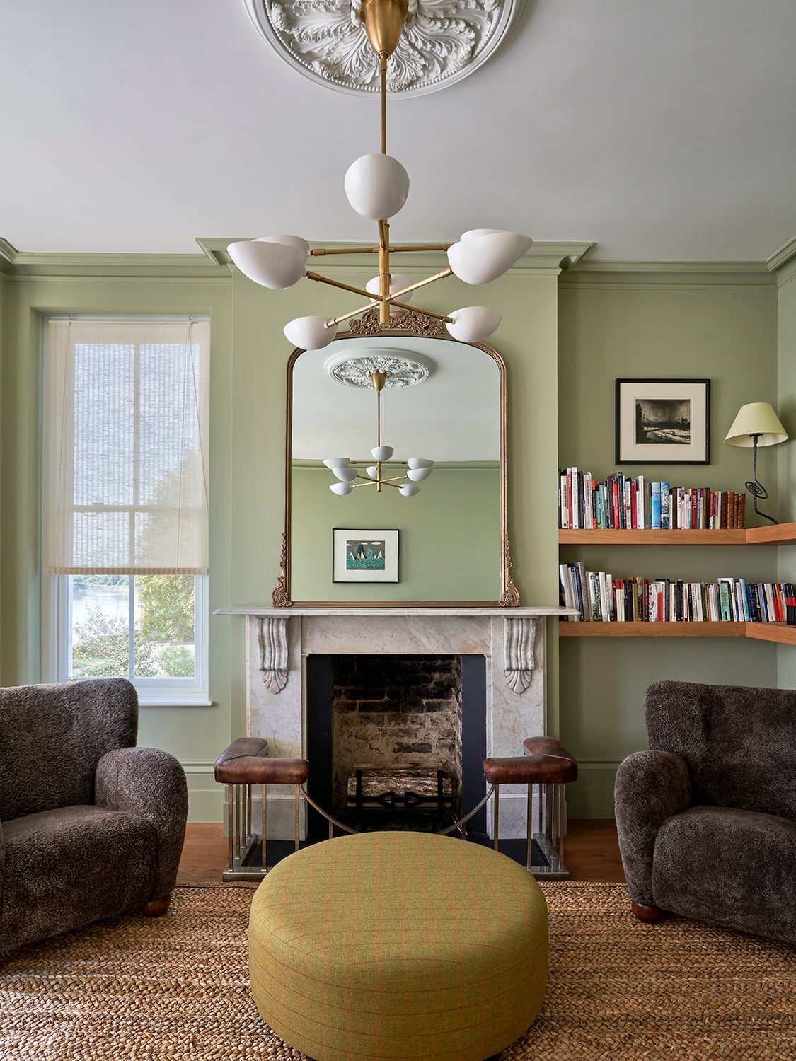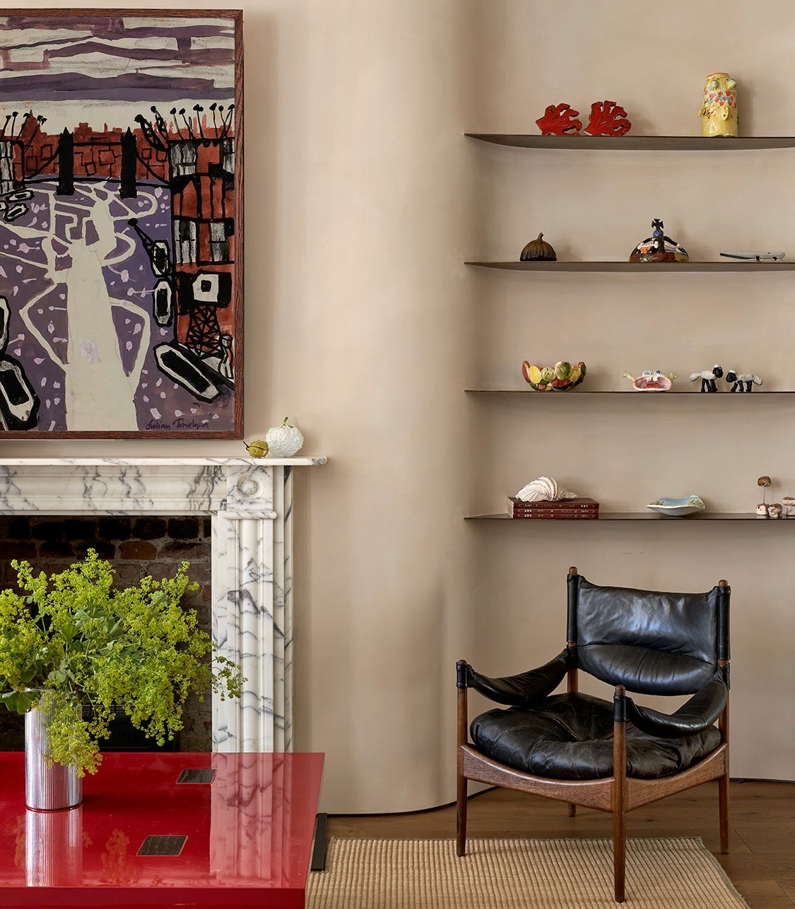 A den with bespoke curvilinear plaster walls hosts custom patinated brass shelves. The soft-tan wall cleverly conceals the skewed orientation of the original walls and flooring, creating a unique floorplan that artfully frames the room’s new fireplace. This centerpiece, made with marble sourced from a local stonemason, foregrounds a vintage silk rug, meticulously cut to fit around the hearth.