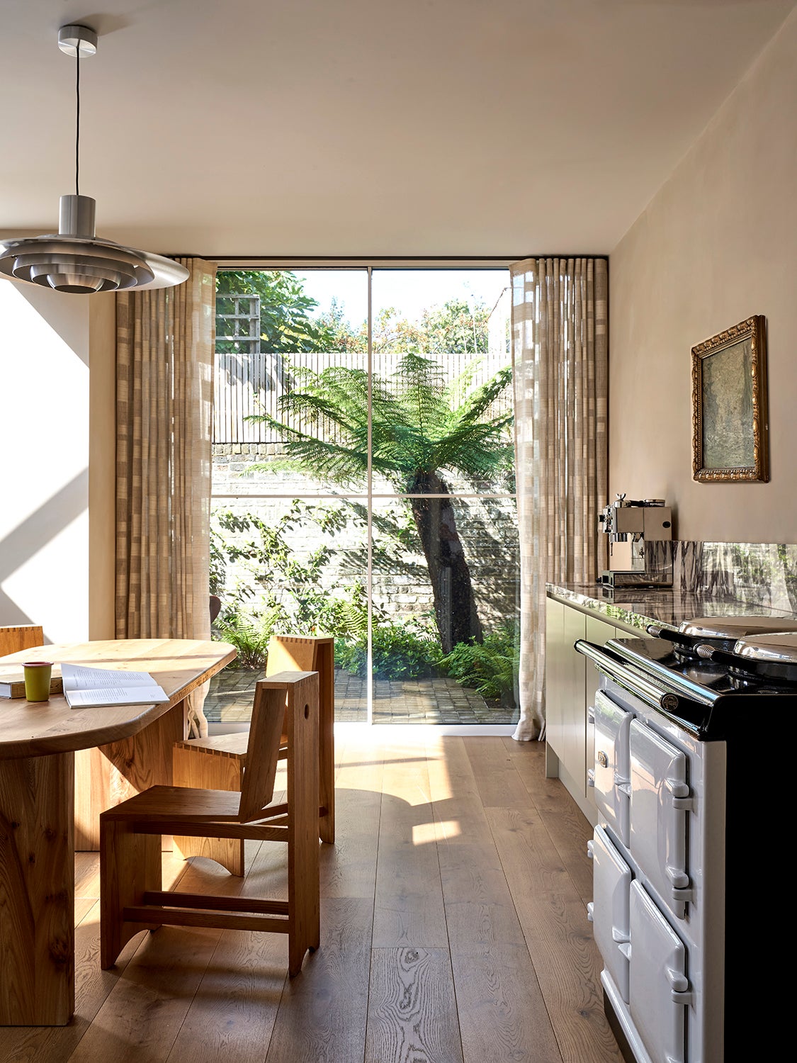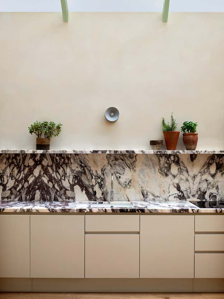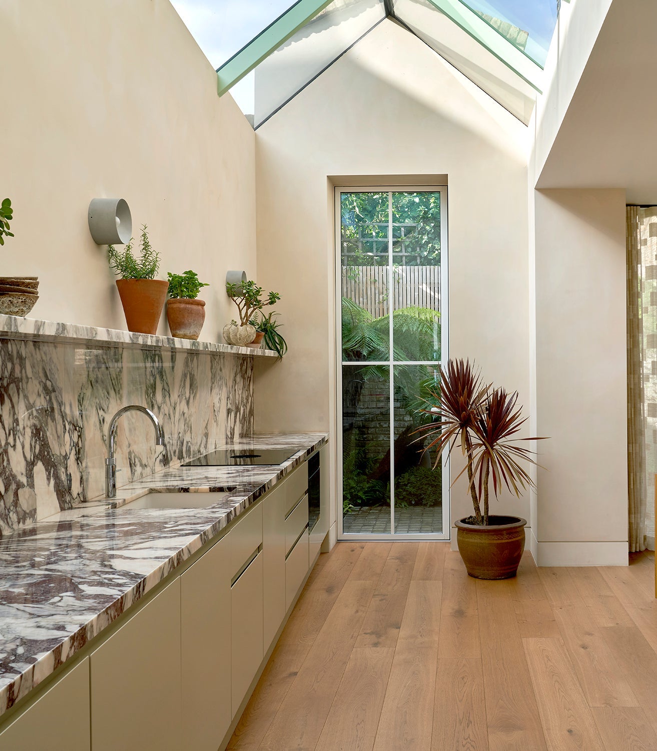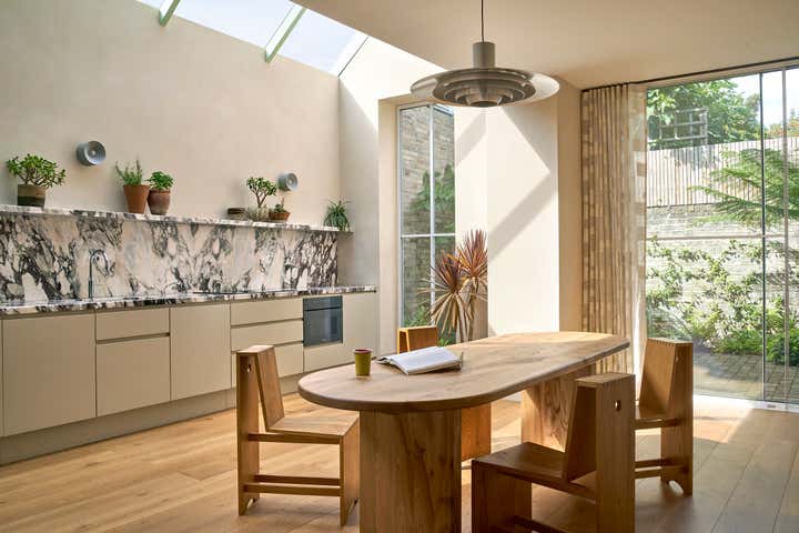 The garden-facing, expansive kitchen features a sunroof and floor-to-ceiling windows, complete with marble countertops.