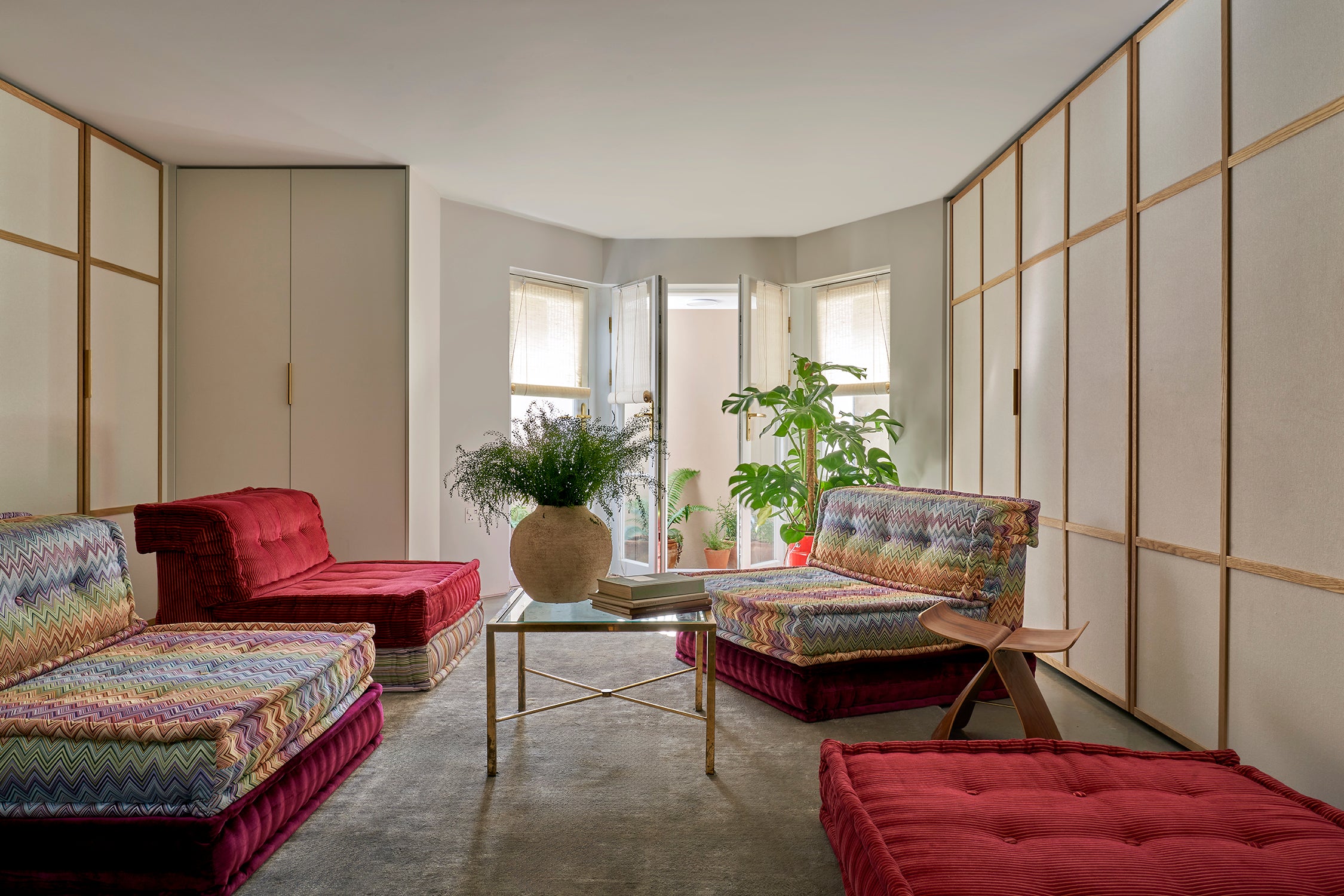 The family's heritage influences are seen through custom joinery and shoji doors, and thoughtful material and colour choices like hemp linen, natural wood, tartan, and mohair. These elements blend with details reminiscent of the industrial-age, like a series of Charlotte Perriand 'Applique à Volet Pivotant' sconces, and sophisticated modern notes like a colourful Hans Hopfer for Roche Bobois Mah-Jong Sofa.