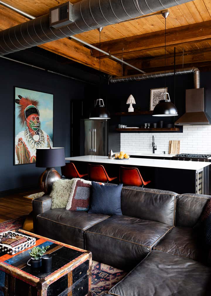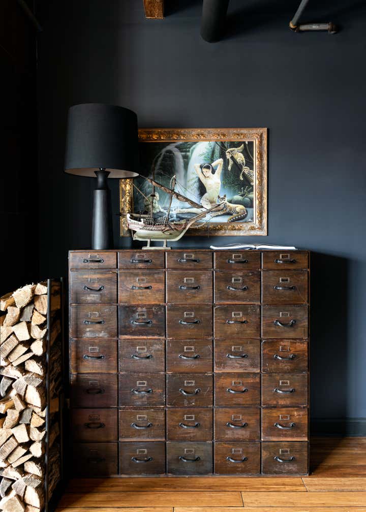 This space was designed for Patrick John Flueger who plays the role of Adam Ruzek on NBC's Chicago PD. Patrick's wish for this space was for the space was "urban viking" and we delivered in the form of dark, moody walls from the Benjamin Moore Century collection, art by house favorite Butch Anthony and an eclectic mix of furniture spanning decades of design.