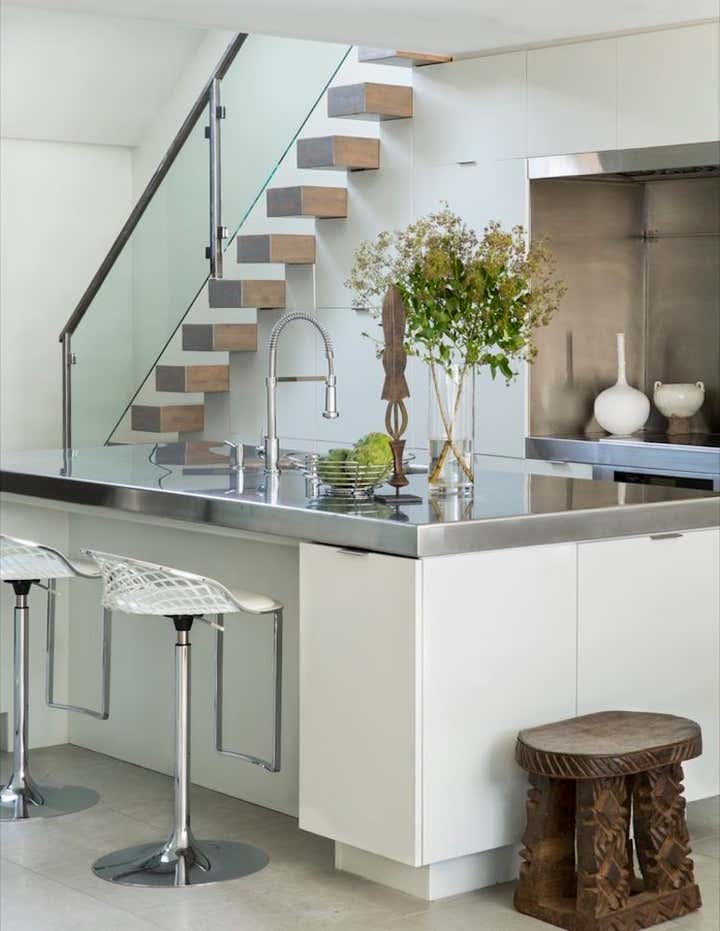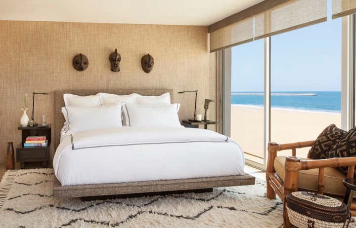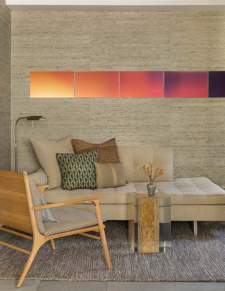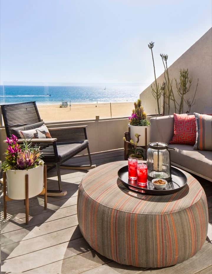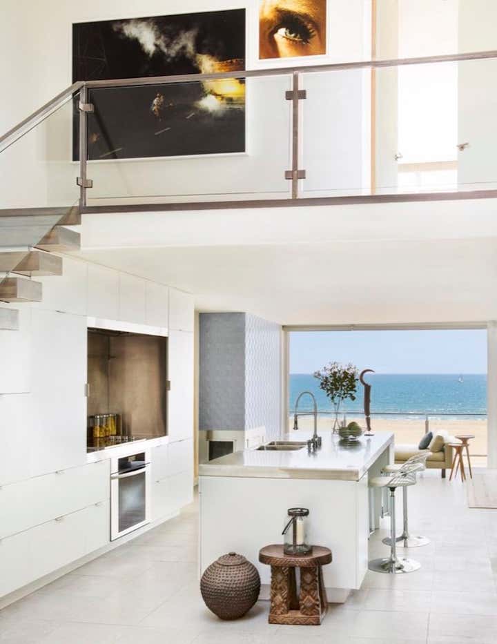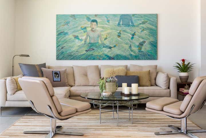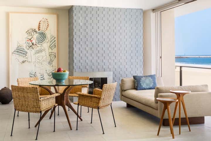 This oceanfront penthouse boasts unbeatable views of the Pacific and occupies a little over 2,000 square feet. Floor-to-ceiling sliding glass doors allow ocean breezes to flow through the open floor plan. Bradley’s color palette brings the outside in with cool blues and neutrals found in the beach and ocean views. His combination of vintage and contemporary furnishings creates a relaxing and functional living space.