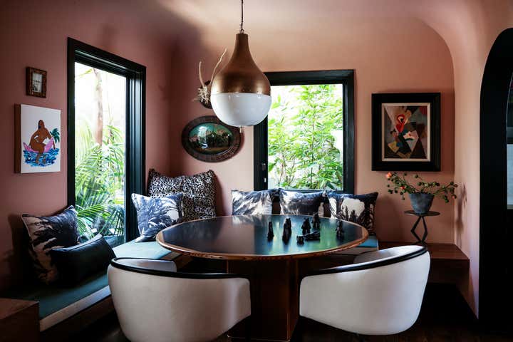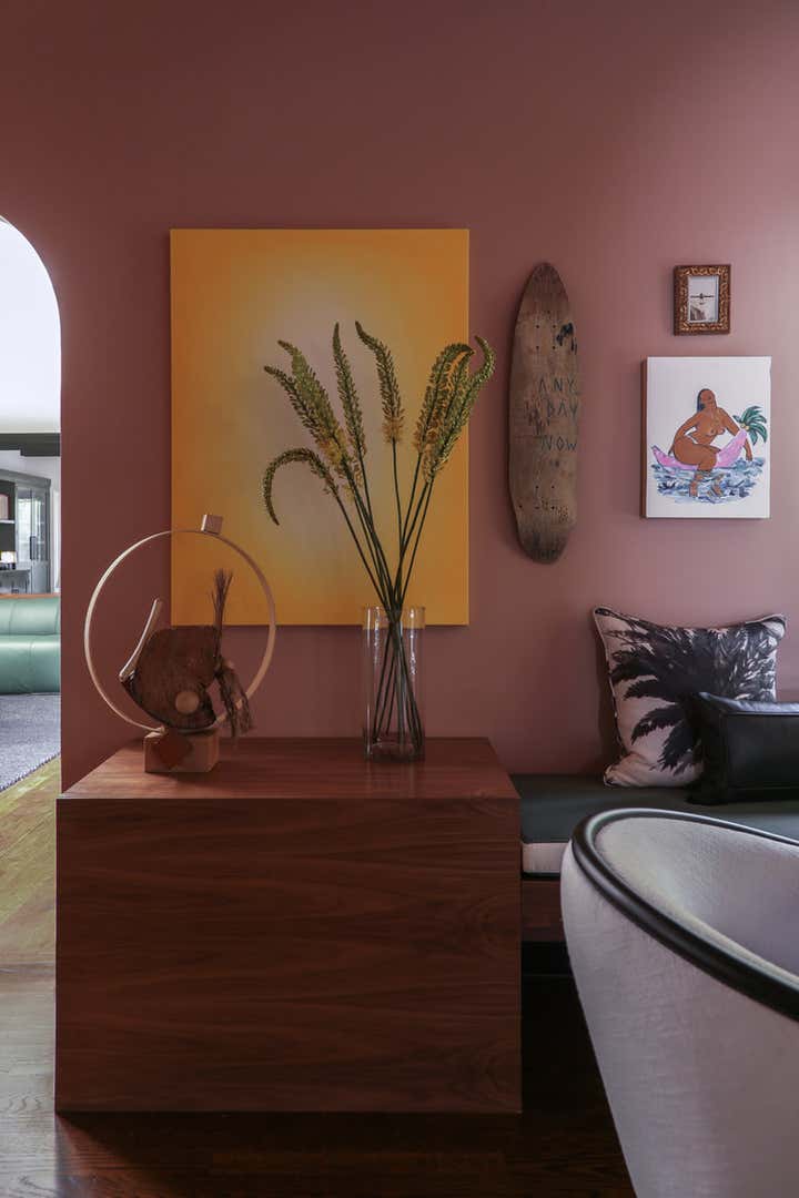 In the dining room a floating walnut banquette wraps two walls providing both cushioned seating and space to display art. We choose a warm pink for the walls and ceiling and filled the walls with artwork giving the room a ton of laid back venice beach vibe.