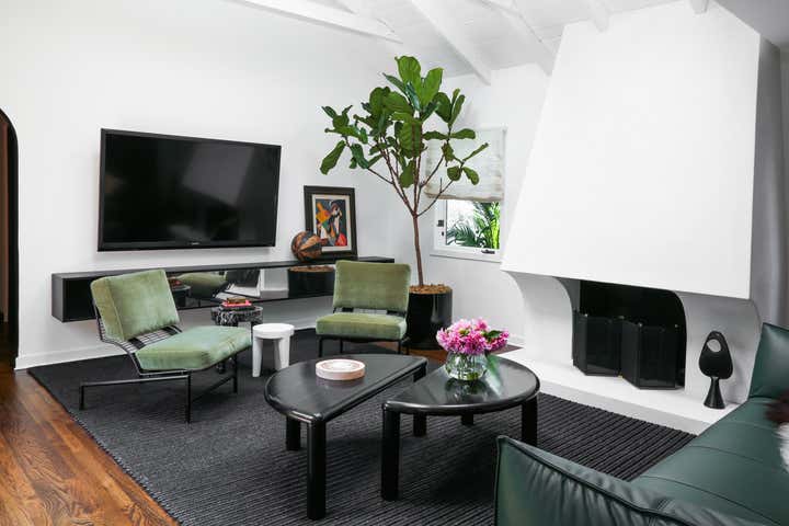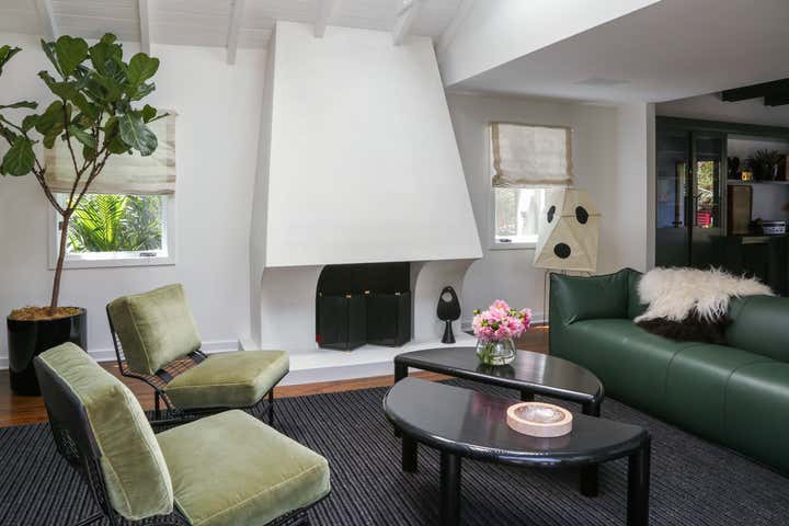 We were given the directive of turning a dated and dark venice beach bungalow into a space that felt, bright, airy without committing to a large construction scope. With our focus to inject a modern, beachy and youthful spirit into the home we first needed to address the existing finishes which consisted mostly of a yellowed raw pine which ran throughout the house in the floors, stairways, beamed ceiling and cabinetry. By updating the palette to walnut floors, white walls and forest green cabinetry the house immediately took on an airy feel. We also re-designed the fireplace working with the existing opening we created a sculptural white stucco centerpiece. We installed large French sliders of the living room to open the house up onto an exterior courtyard which not only brought in additional light but offered the sought after indoor/outdoor experience. The outdoor courtyard features a fountain wall with a hamamm drip faucet, twin iron daybeds and plenty of lush plants – giving the home beautiful views to the outside as well as private lounging space.
