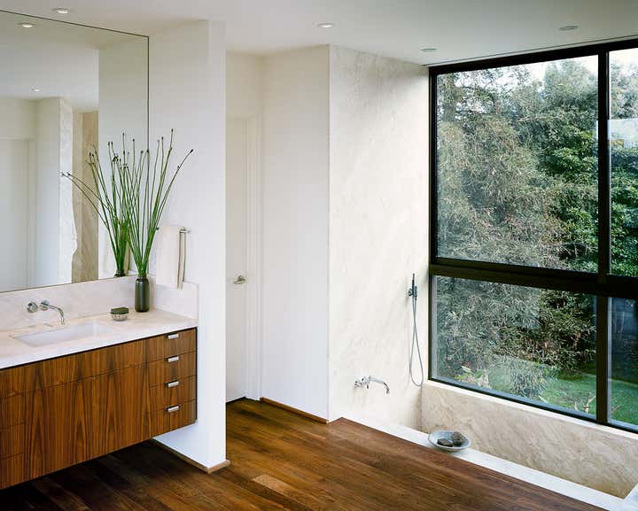 We designed the interiors to work with the architecture and landscape to create continuity between the interior and exterior. The lush California native landscape inspired the color palette of grays, browns, and greens that complements the custom walnut and concrete finishes that extend to the outdoor areas. We selected indoor furnishings of walnut, leather, and velvet, and outdoor furnishings of steel and teak to reflect the home’s emphasis on clean lines and proportion.
