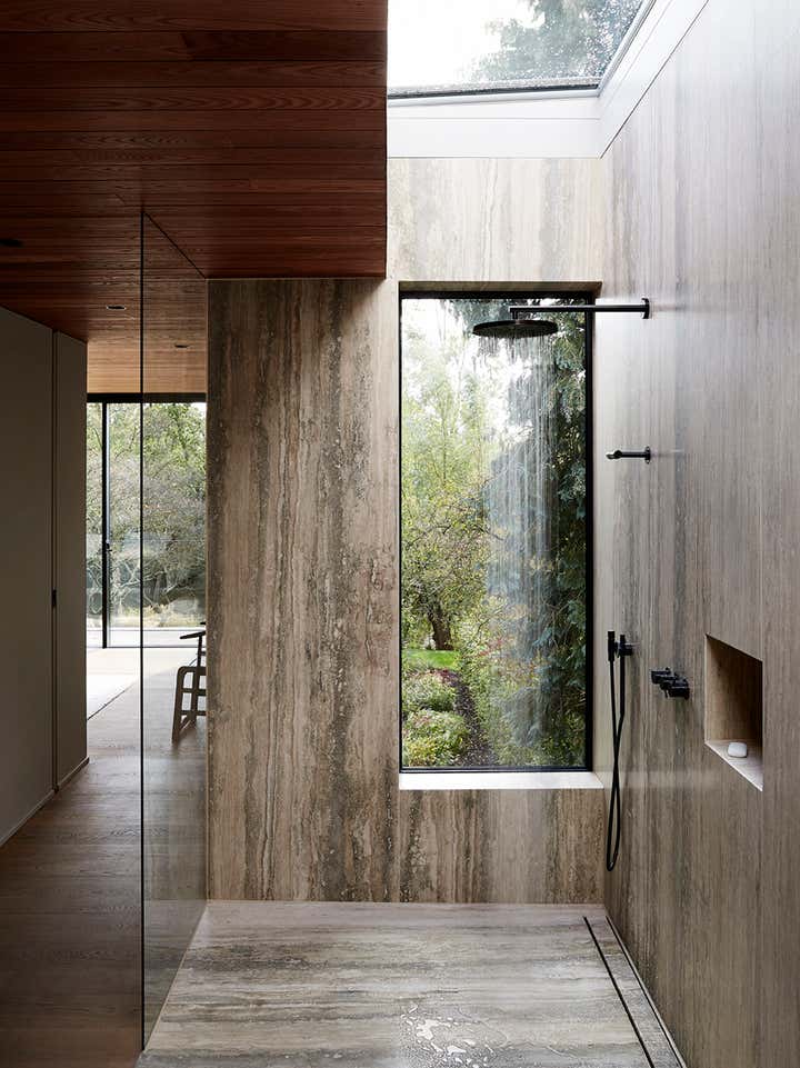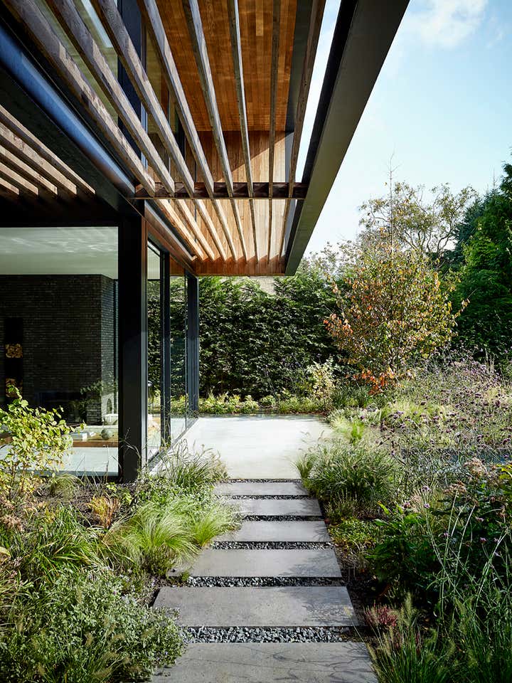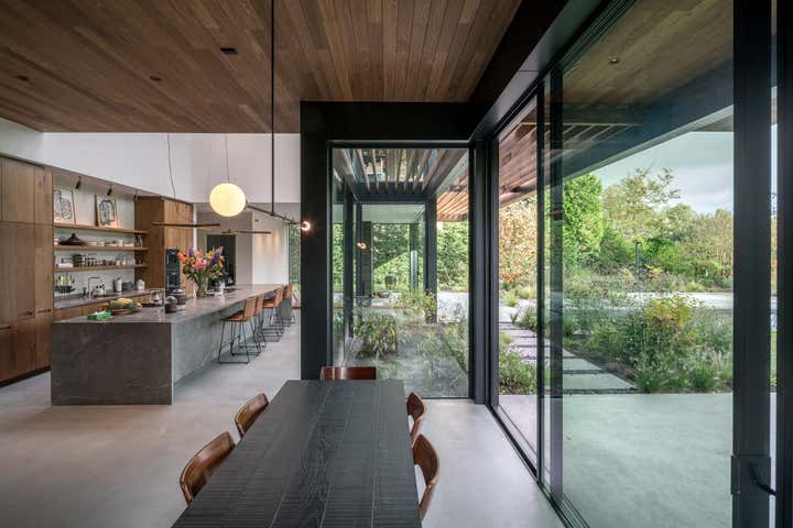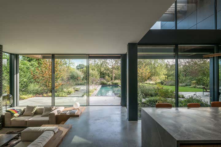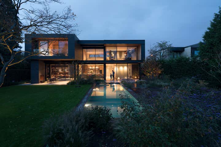 Located outside of the city center on a large site, this home for a young family frames views of the garden, canal, and natural area beyond. Respectful of its midcentury residential neighborhood, the largely opaque front and sides of the house provide privacy and a stark contrast to a back elevation of glass and steel.