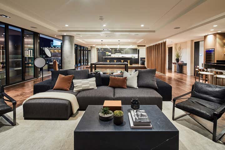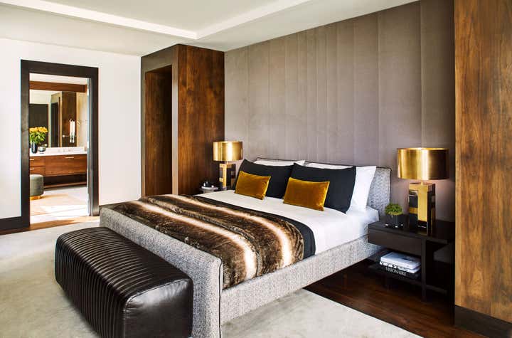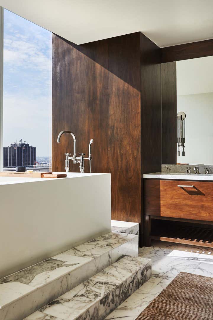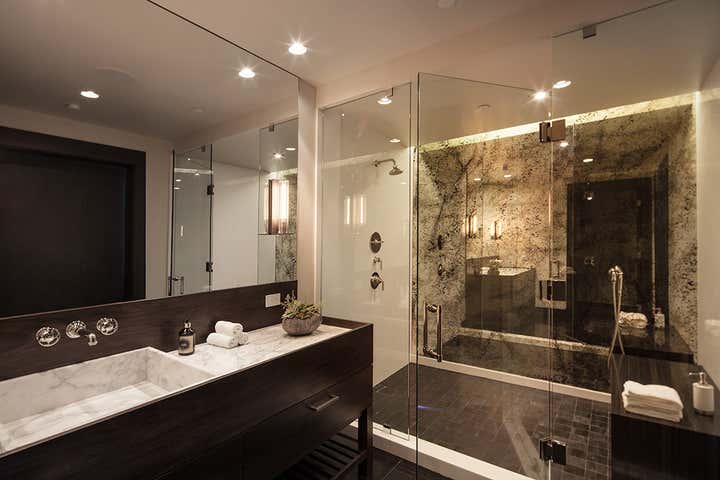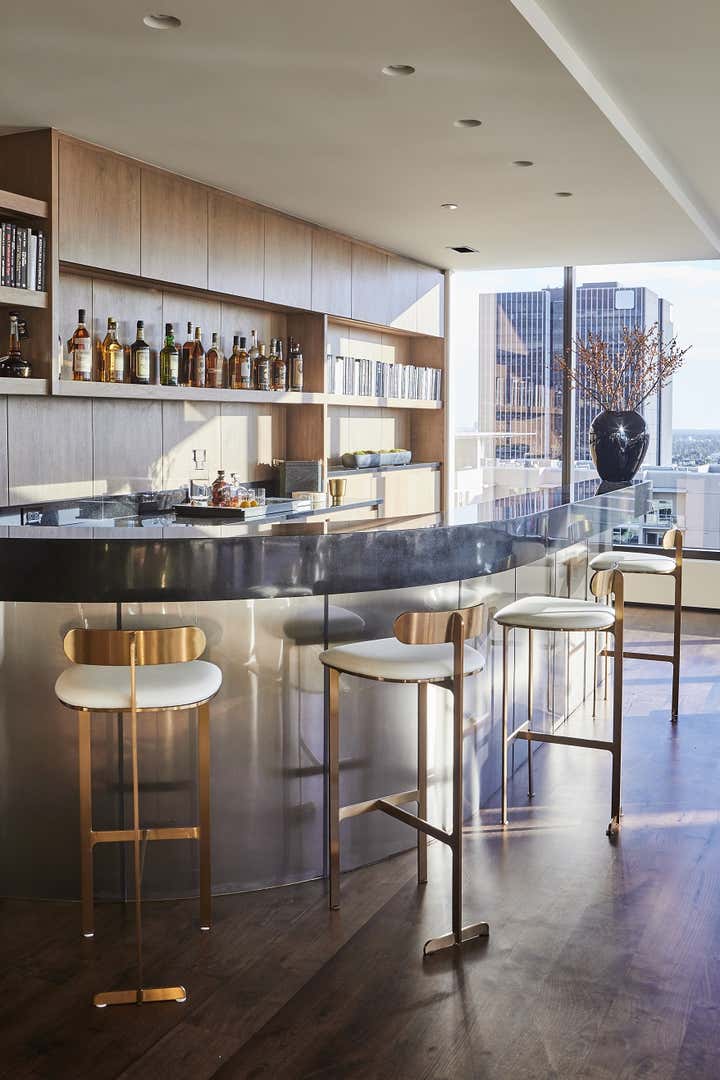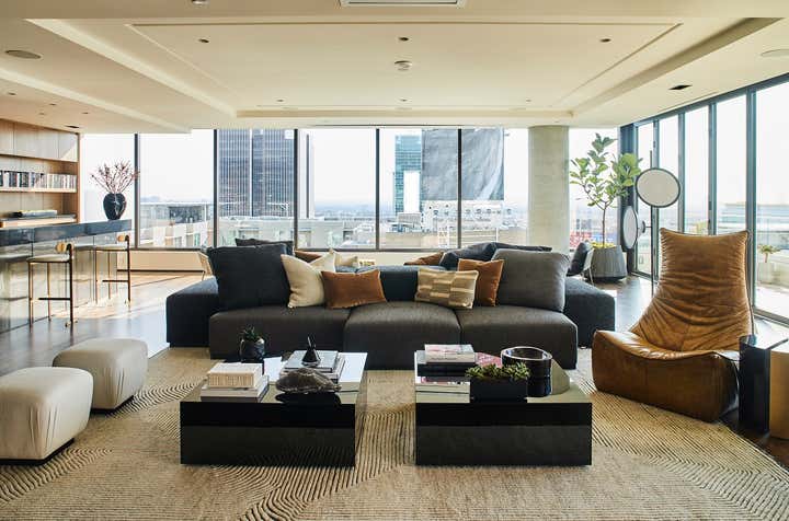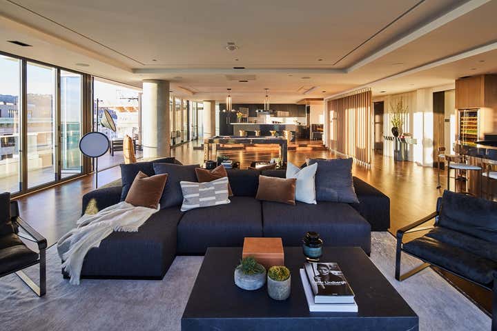 Inspired by the Brooklyn-esque nature of the surrounding historic buildings, this three-bedroom, four-bathroom penthouse pairs sleek, urban-contemporary design with luxury finishes and materials, reflecting industrial luxe aesthetics throughout the 4,708 square foot home. The glass-walled residence also features a secret bunk room and striking vistas of downtown LA to the Pacific and Hollywood Hills command attention from the 827 additional square feet of outdoor living space. An array of diverse raw materials create dramatic contrasts in design displaying unique combinations of rich wood grains, hints of metallic glazes and hammered metal cabinetry provide a relaxing and comfortable pied-a-terre, the epitome of modern, sophisticated urban living.