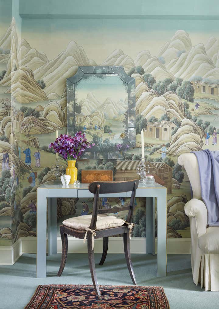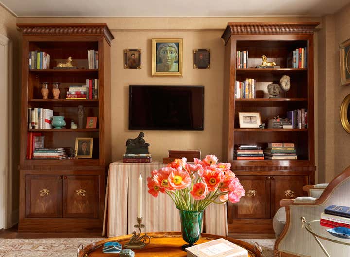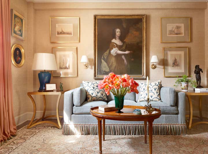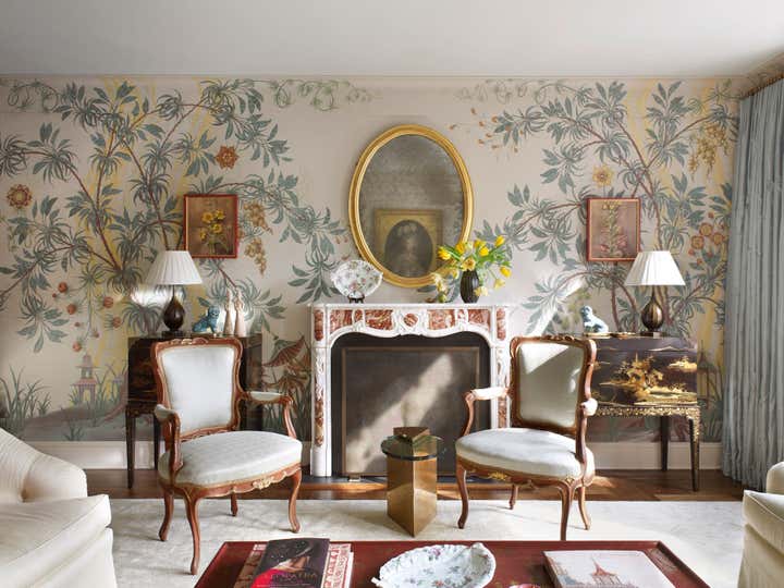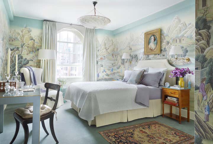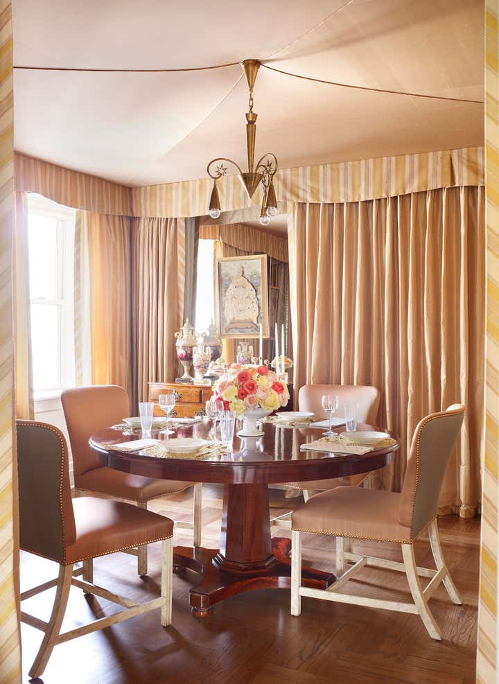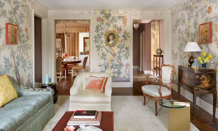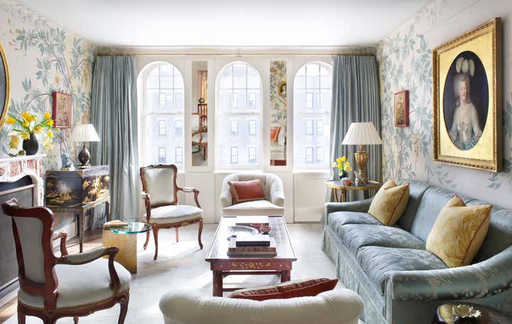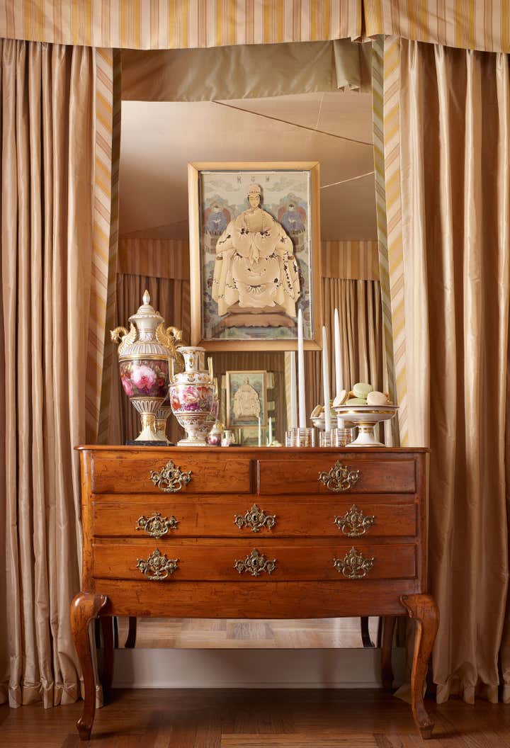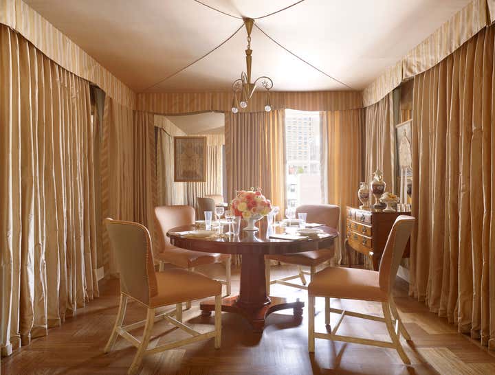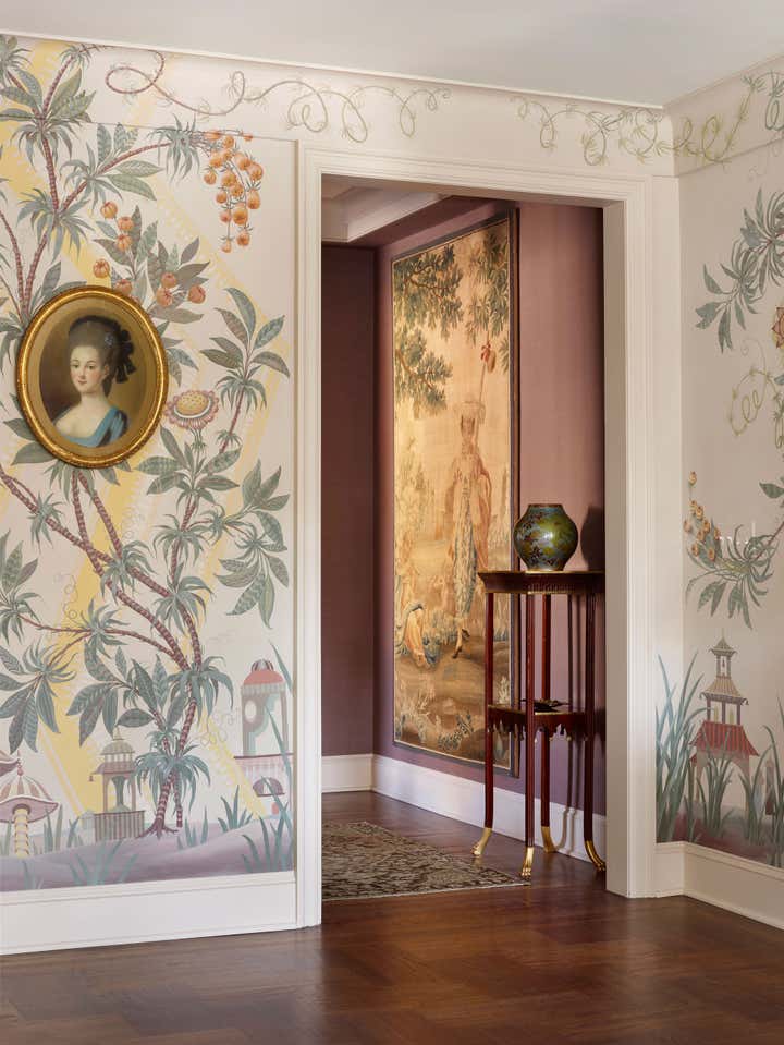 At the start of this project, Thomas Jayne offered the client the concept that within this relatively small two-bedroom apartment on the Upper West Side of Manhattan, each room could have a distinct theme and personality, much like the rooms found in grand historic houses. He suggested that the living room feature boldly painted walls based on a pattern for an 18th-century English dress silk, the second bedroom be turned into a library displaying the client's collection of 18th century portraits, and the bedroom be hung with Chinese wallpaper with views of villages. The dining room would be draped to resemble a tent, and the two connecting halls would be covered in aubergine silk. All of this, of course, ran counter to the accepted wisdom that in smaller spaces it is best to keep things neutral and free of large patterns, but the client was game. Now this apartment has been enriched to the point that it looks much larger than it is.