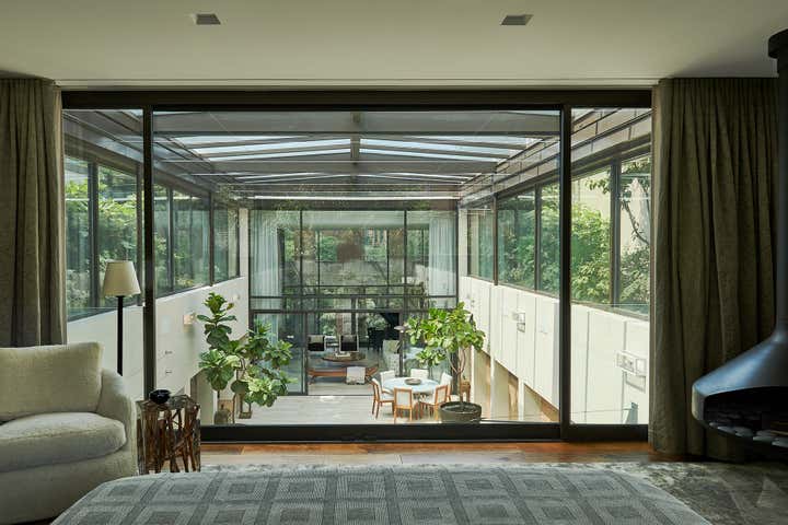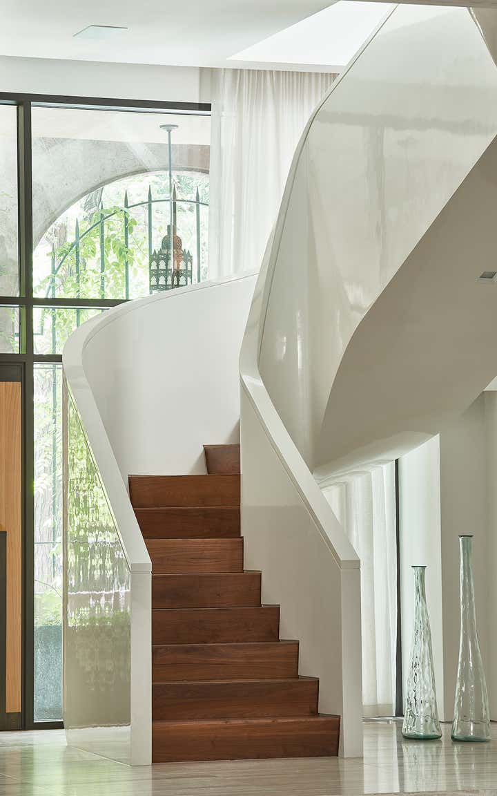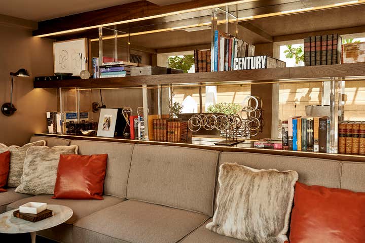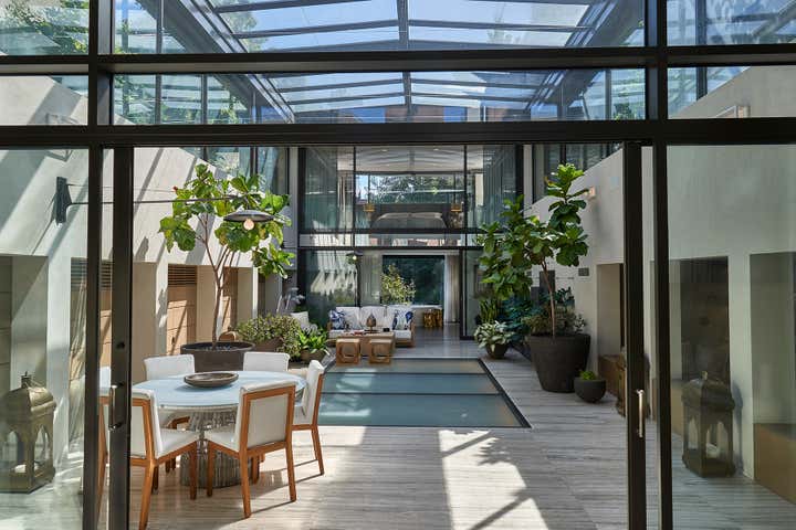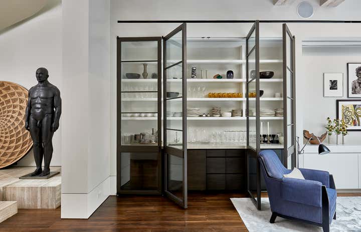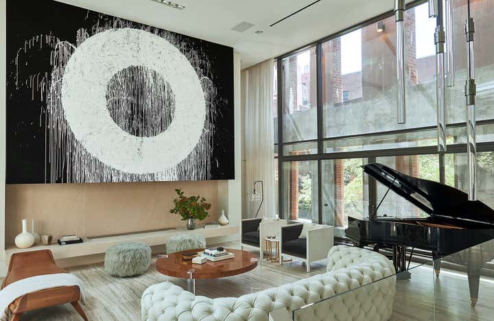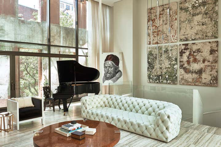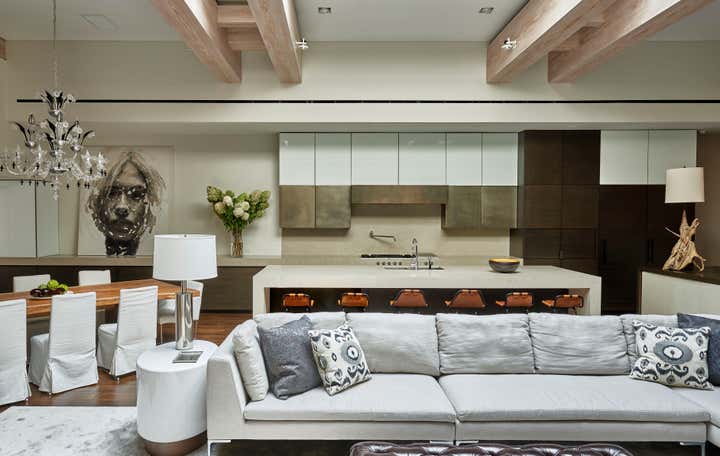 This residential interior was all about wow factor. The enormous skylight over the kitchen and family rooms turns out to be the atrium's floor. The atrium itself is bookended by the living room and lower level of the duplex master bath. Throughout, the furniture selections are eclectic - from a white Chesterfield sofa and purple-felt pool table to a live-edge dining table. It is a passionately collected home.