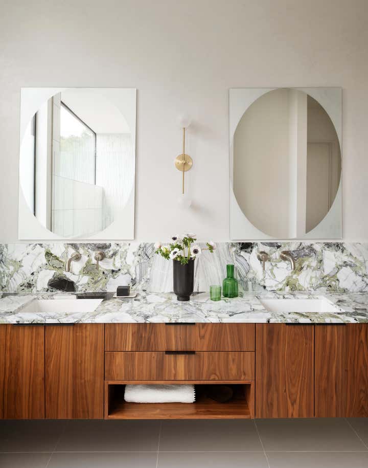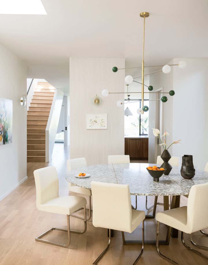 For the furnishings of the home, Cukerbaum selected standout pieces including a custom round table with Ann Sacks Terrazzo Renata marble, a Yoma Lyon - Spruce Sofa, an abstract Bower Studios mirror and a vintage mid-century coffee table from 1stDibs. The home boasts vibrant lighting fixtures including the modern “Orbital” Chandelier by Blueprint Lighting and the Cleo Pendants by Kelly Wearstler.