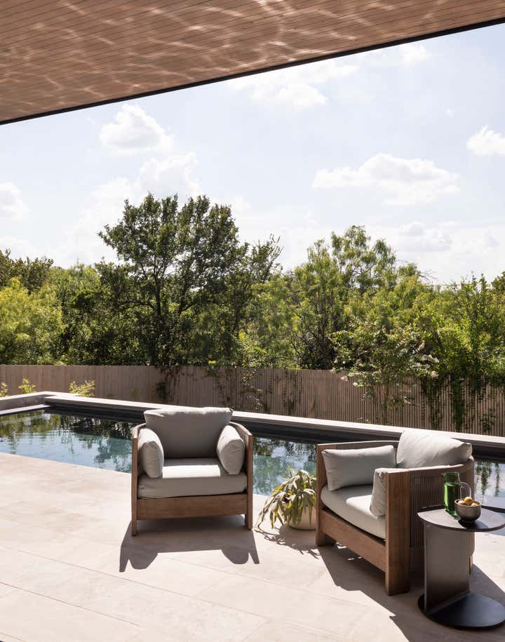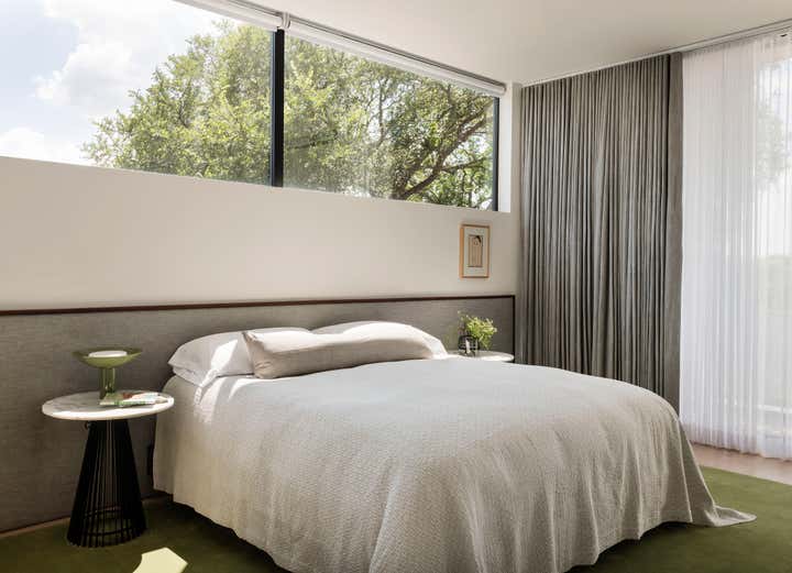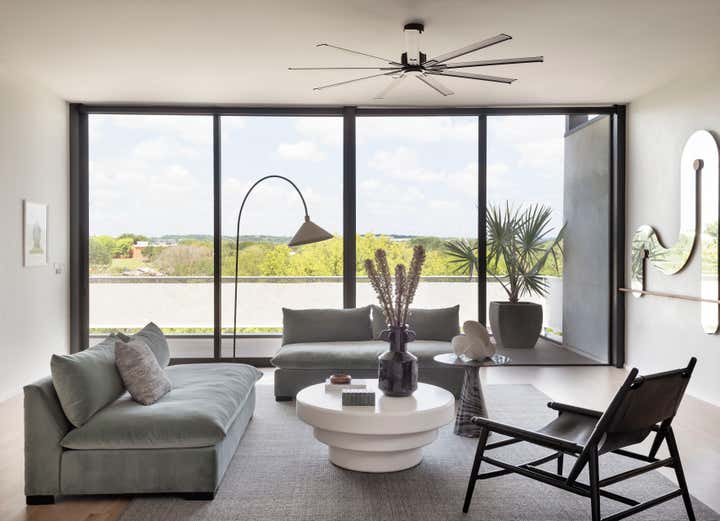 The living room features floor-to-ceiling windows that open out onto a terrace overlooking the backyard and pool, with scenic views of the iconic rolling hills of Austin. Contrasting the dining room and kitchen, the living area is composed of dark muted tones to create a calming atmosphere. To create an open and airy space, the floors throughout the home are finished in light oak wood, and the walls leading to the stairs and within the kitchen are finished in Venetian Plaster in Benjamin Moore Light Pewter. Off the dining area is a white marble waterfall island that extends across the spacious and open kitchen.