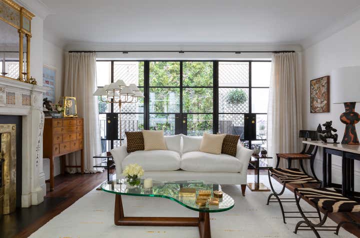 Wilton Place is a classic townhouse, now seven storeys, which we completely restructured and renovated. The aim was to bring understated contemporary glamour within the 19th Century structure. A spacious entrance hall and gallery, with adjoining wood-panelled study, sets the scene. The ground-floor drawing room has a sensational fireplace, making an elegant formal room. A new central staircase links to the heart of the home, an aged brass embellished kitchen that opens to a courtyard with fountain. An intimate dining room and relaxed snug complete the entertaining spaces. The studio has created a generous terrace, with jasmine-covered pergola. A living green wall opposite scales three storeys, providing a vertical oasis in the city. Sleeping quarters include a light-filled master suite, chic marble bathroom, and shagreen dressing rooms. Further guest bedroom suites fill the next floors. The studio has worked with fine fabrics, antiques, and bespoke Bryan O’Sullivan Studio pieces to ensure each space is a perfect sanctuary.