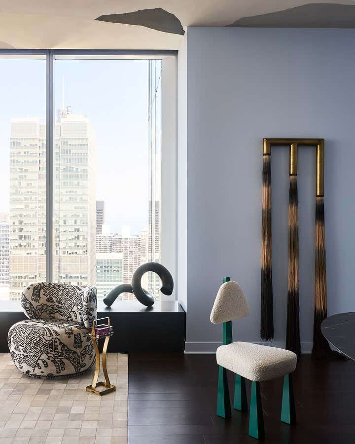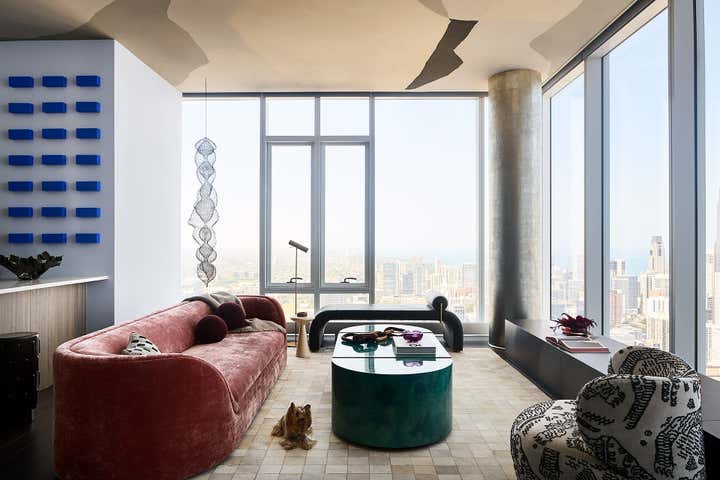 Penthouse views accentuated by fearless color, showstopping art, and bold sculptural furnishings elevate a home already set among the clouds. The result: a sophisticated (with a dash of whimsy) solo pad comfortable enough to enjoy an unplugged Saturday morning or an intimate dinner party. As seen on the cover of Luxe Interiors + Design Chicago.