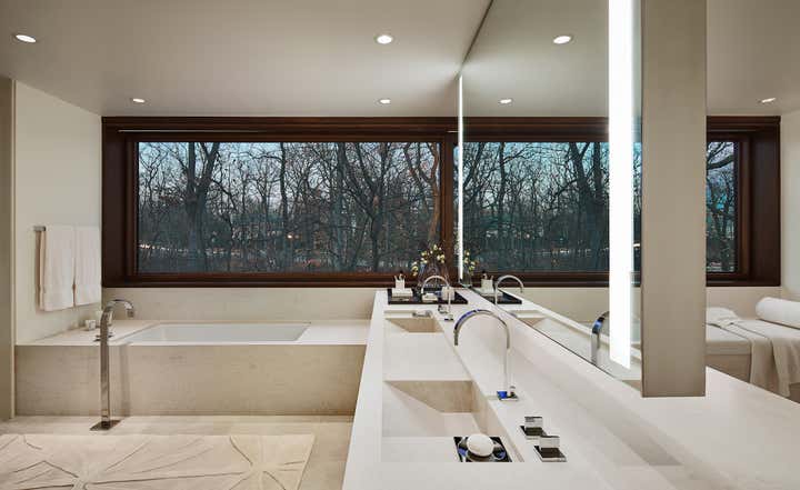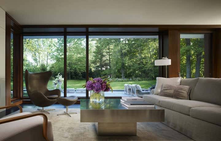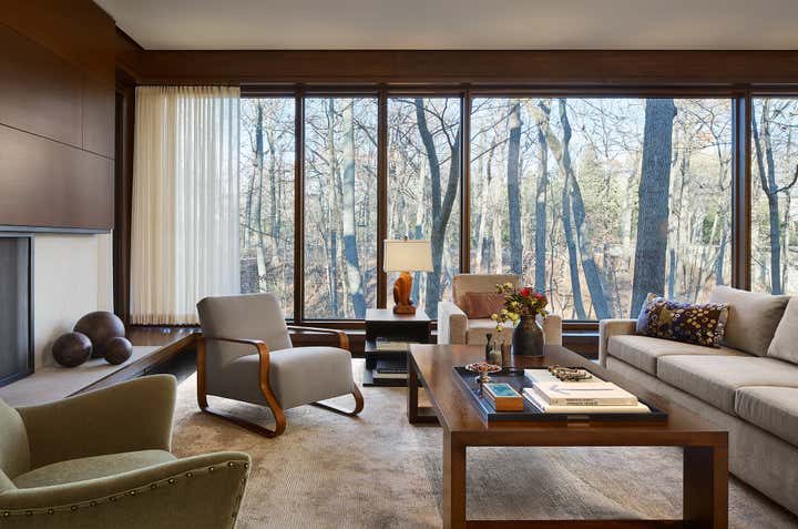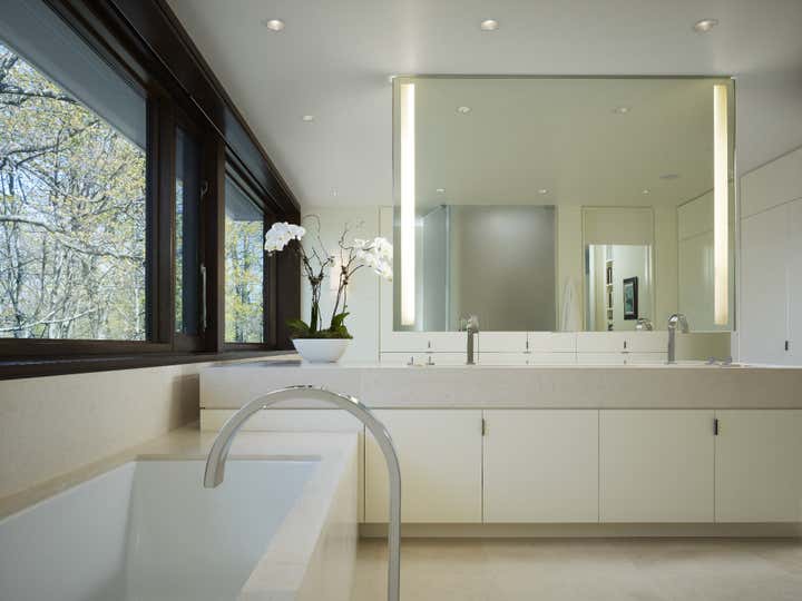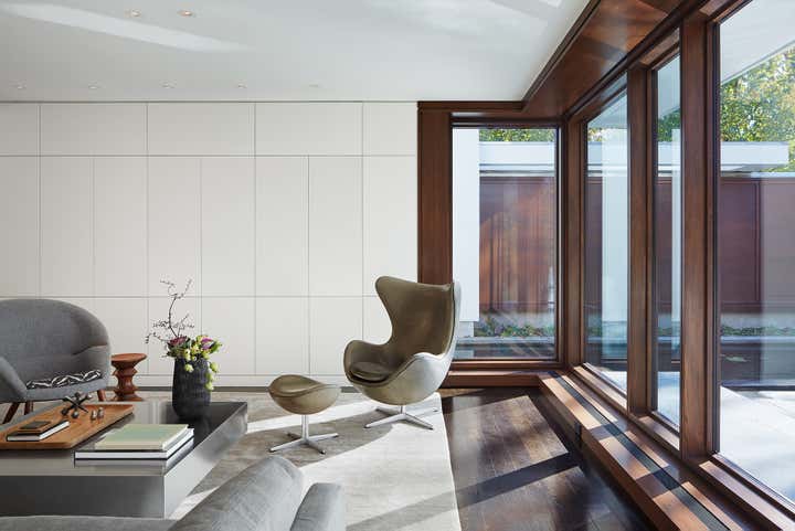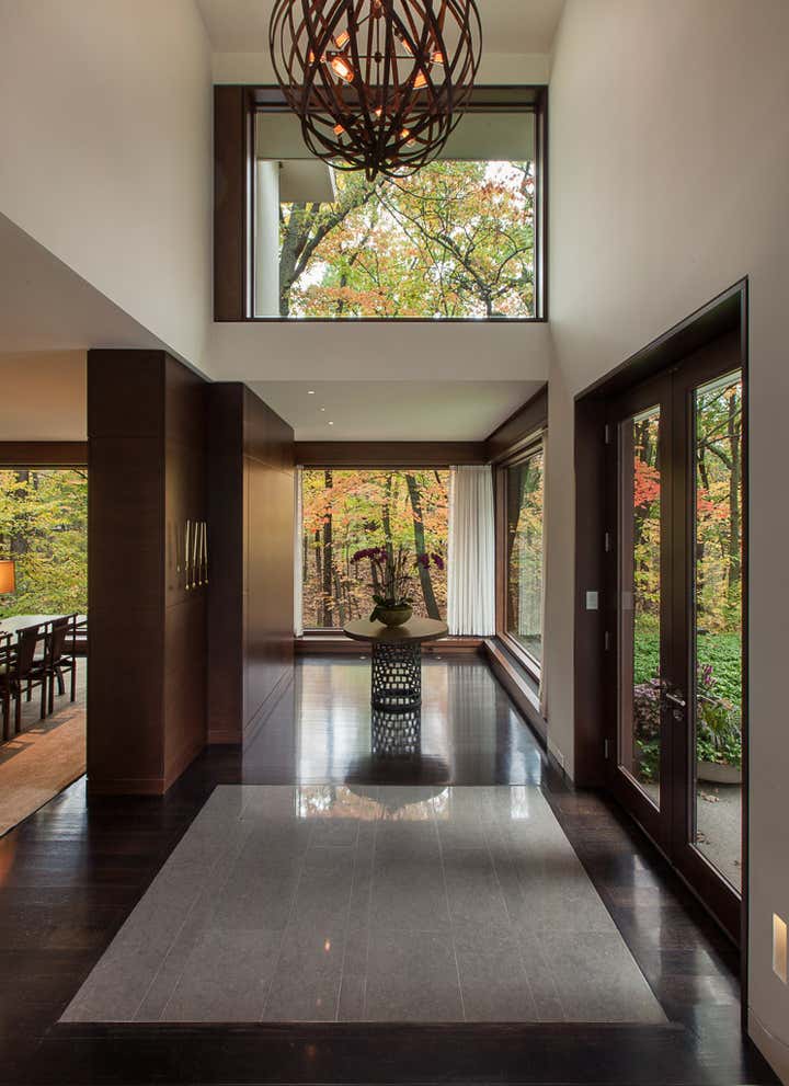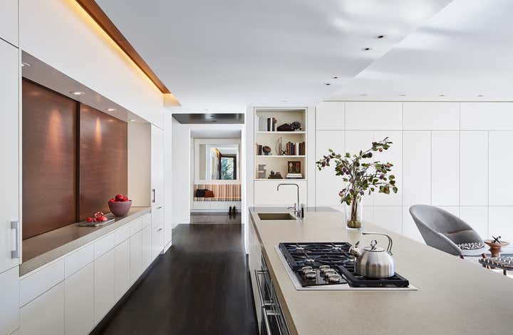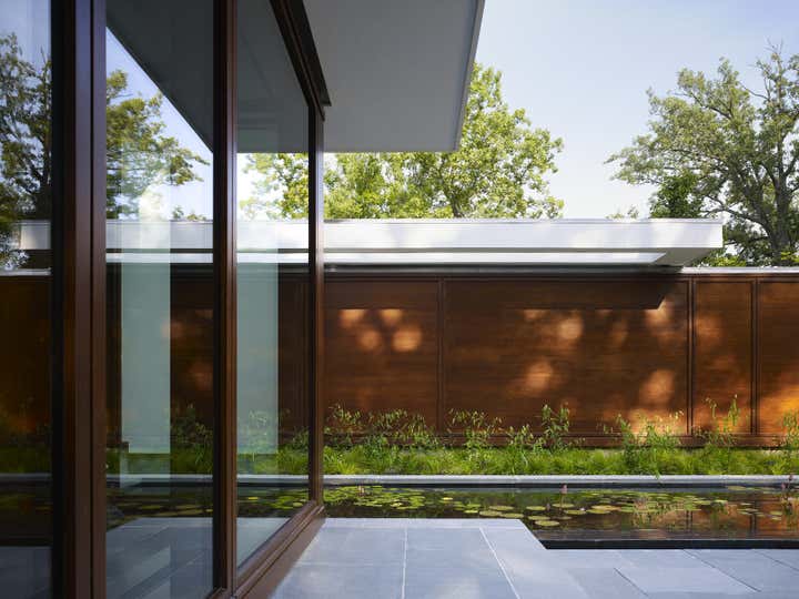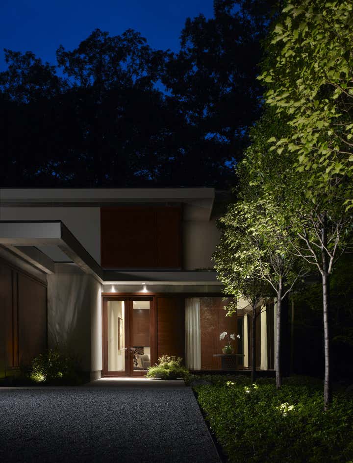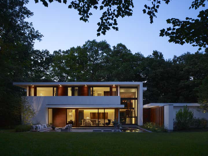 Placed within a tree-layered ravine, this home is situated between a densely wooded slope with an intermittent stream that gracefully wraps the property. Using timeless principles of modern architecture, a two-story modern form complements the serenity of the home’s setting. Setbacks and roof overhangs were used horizontality in the massing to bring down the overall scale of the structure and keep the home from dominating its context. Inside, spaces traditionally organized as separate rooms are joined together to create a light and open informal floor plan.