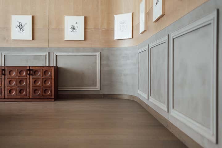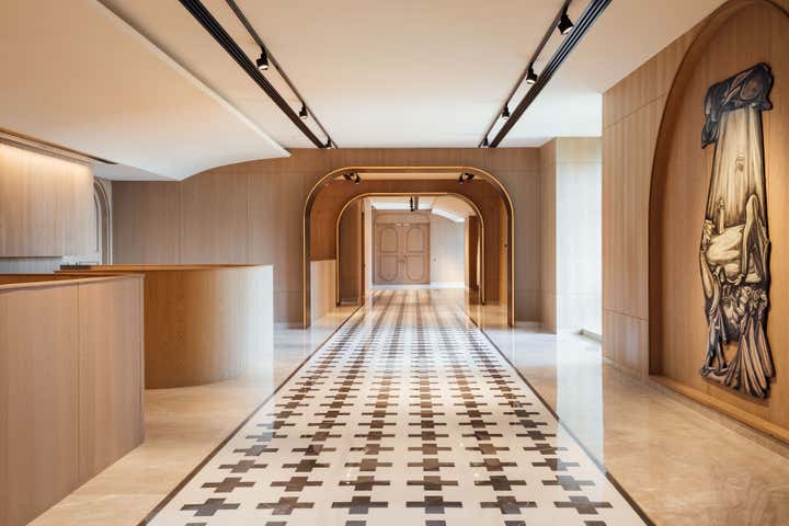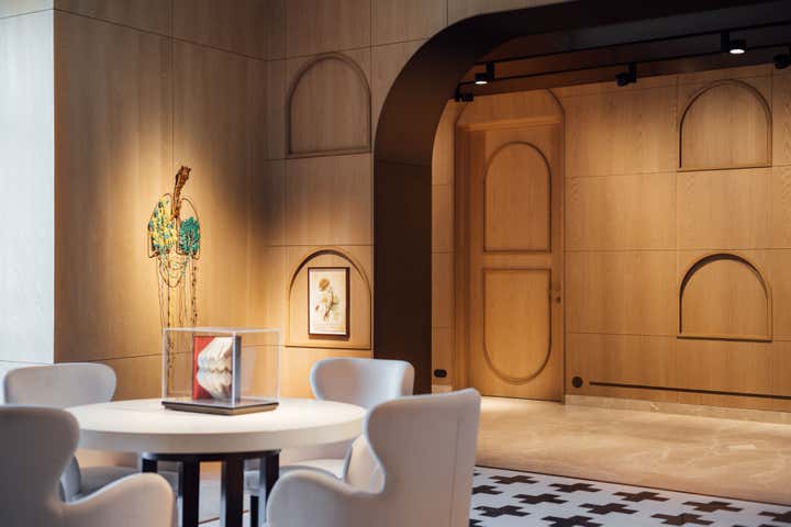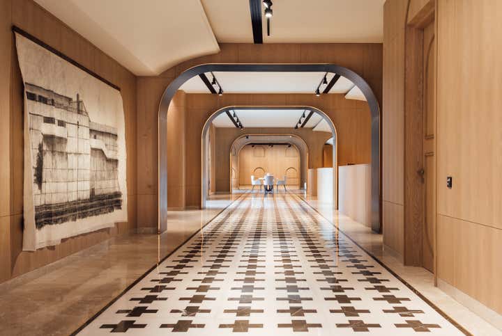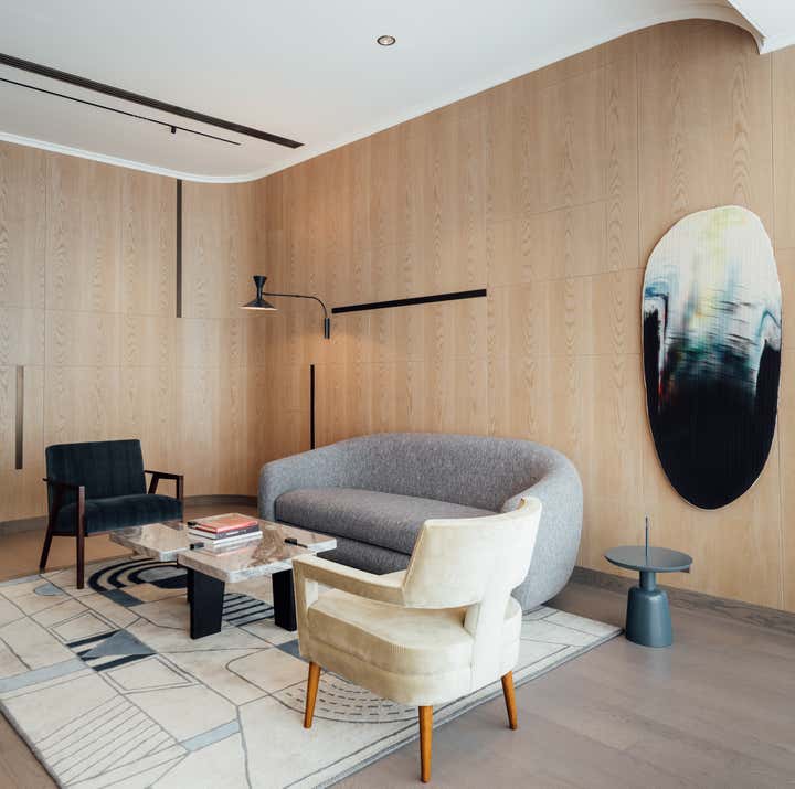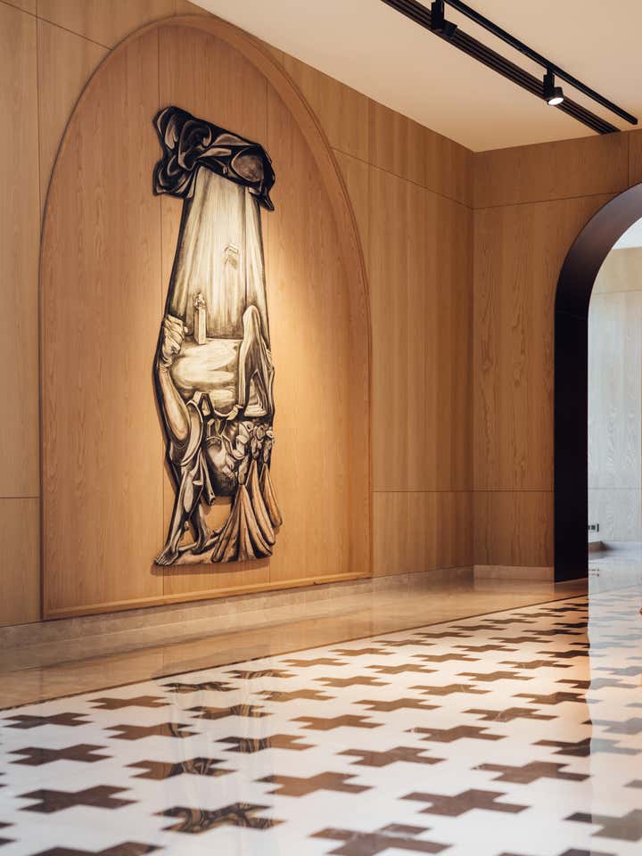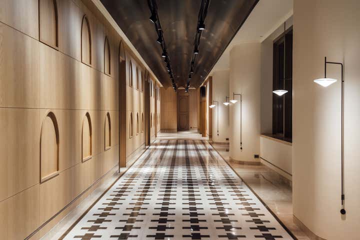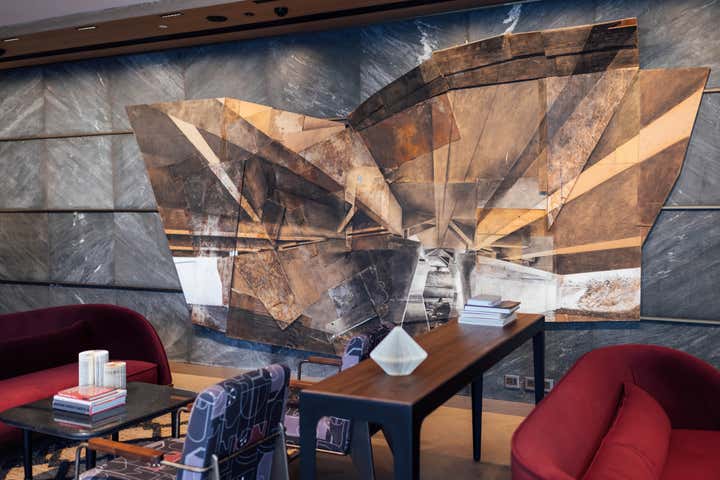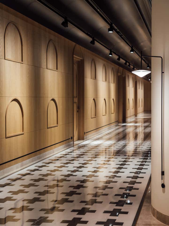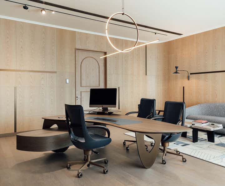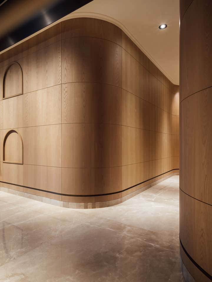 The materiality of the space is crisp and balanced. Warm dyed oak veneer on the walls is offset by sharp black and white of the flooring stone inlay & soft grey stone surrounds the rest. Wooden floors in a darker tone form a subtle contrast inside the individual offices. Subtle strips of bronze draw sharp lines to accentuate the spaces. Art forms the final detail in this layered, tailored space.