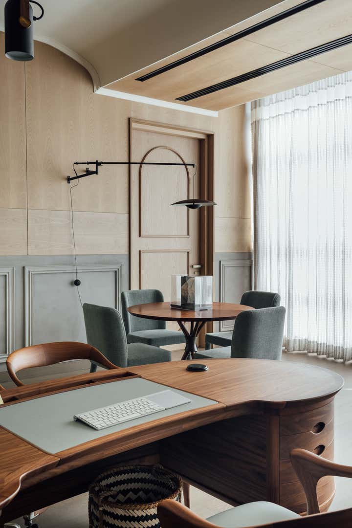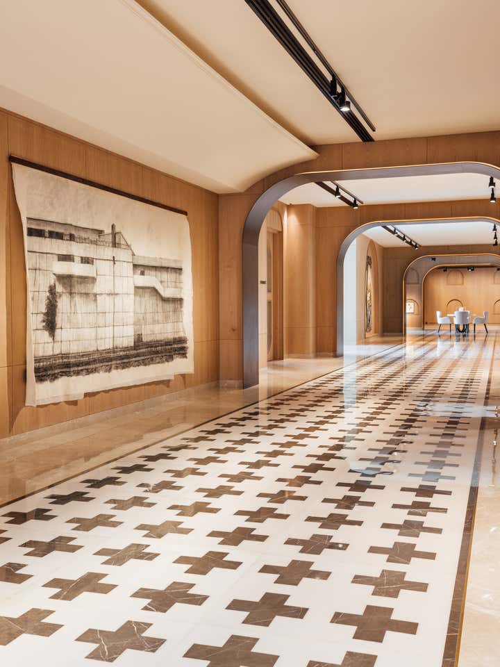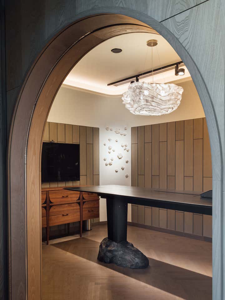 Our brickwork design ensured that all the corners were softly rounded. The receding arches create a perspective in one of the 2 long corridors leading to both the wings. The ceilings dip, curve and vault. Arches abound in the form of niches on the wall that house custom installations & the doors nod slyly to 2 halves of a capsule. Two significant spaces have a round niche that houses art and lends a nod to the form inspired design. The design is bespoke and contextual in more ways than one. The flooring inlay pattern seen across the corridors of the space is derived from the company logo as is the massive custom boardroom table & other meeting tables which playfully interpret the cross form from the client’s logo in multiple ways, from bronze inlays to sculpted 3d forms. The company division that works on developing products which are organic & natural has a custom designed table in their meeting room where the base mimics a rock. The curved corners of the walls have a handmade custom installation of porcelain art pieces that are an abstract representation of all plants & marine ingredients etc. that go into the products.