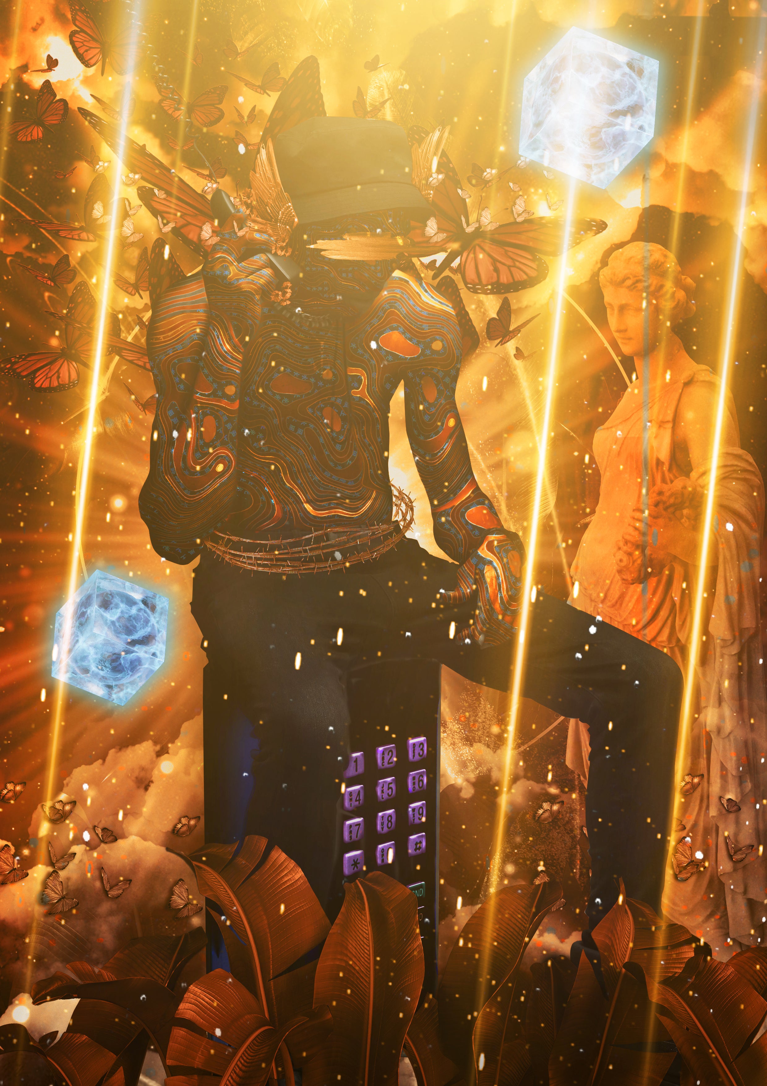 For 25-year-old artist Tetra, the allusion to the baroque doesn’t come as a surprise. “I’ve been into Caravaggio from young,” he says, citing Virgil Abloh’s streetwear designs as his introduction to the Italian master. A first-generation American of Cuban and Dominican descent, he synthesizes diverse influences in his work, including video games and anime, as well as Renaissance art.
