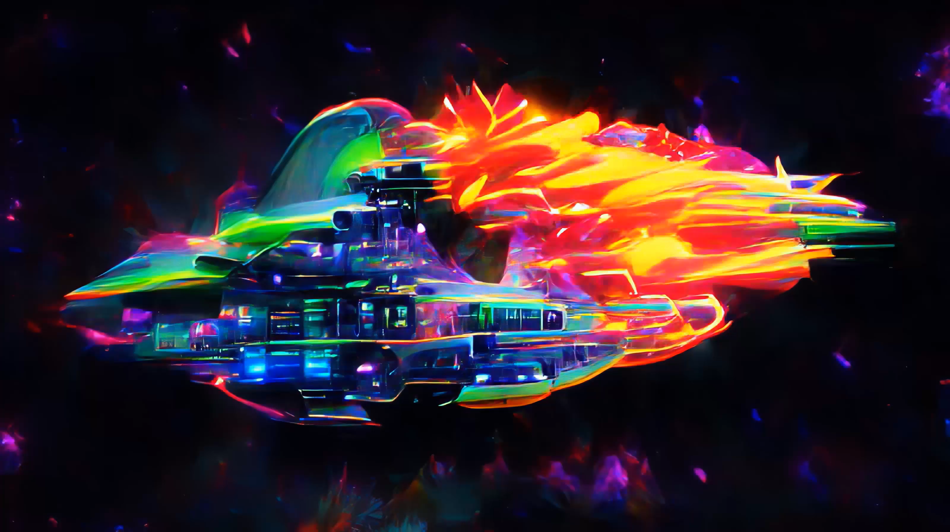 Her own pieces often reference the Jungian idea of the collective unconscious, incorporating liminal symbols like spaceships, UFOs or bridges. To create a piece like It Exploded #2 (2021), Spalter briefed a system known as an “adversarial network,” in which two AIs work in competition, one of them absorbing material that has been identified as showing a particular object (for instance “flying saucers”) and attempting to define its character and the other repeatedly trying to produce images that meet the criteria established by the first.